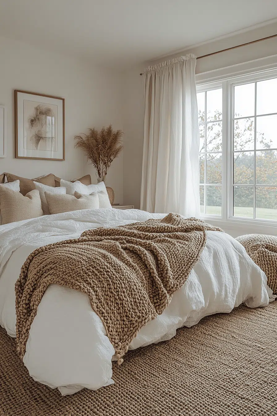 - Materials: textured cotton quilt, chunky knit chenille throw, sheer white curtains, ceramic vase with dried branches
