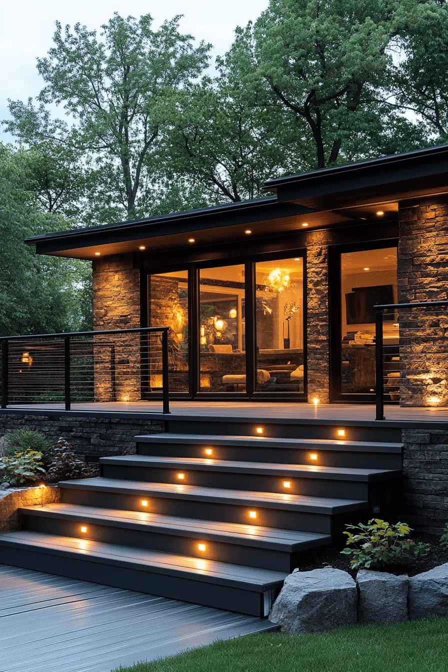 - Lighting: integrated LED strip lighting along deck railings and recessed uplighting in deck planks for evening ambiance