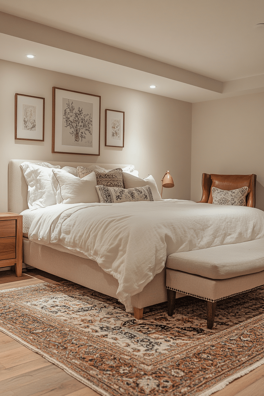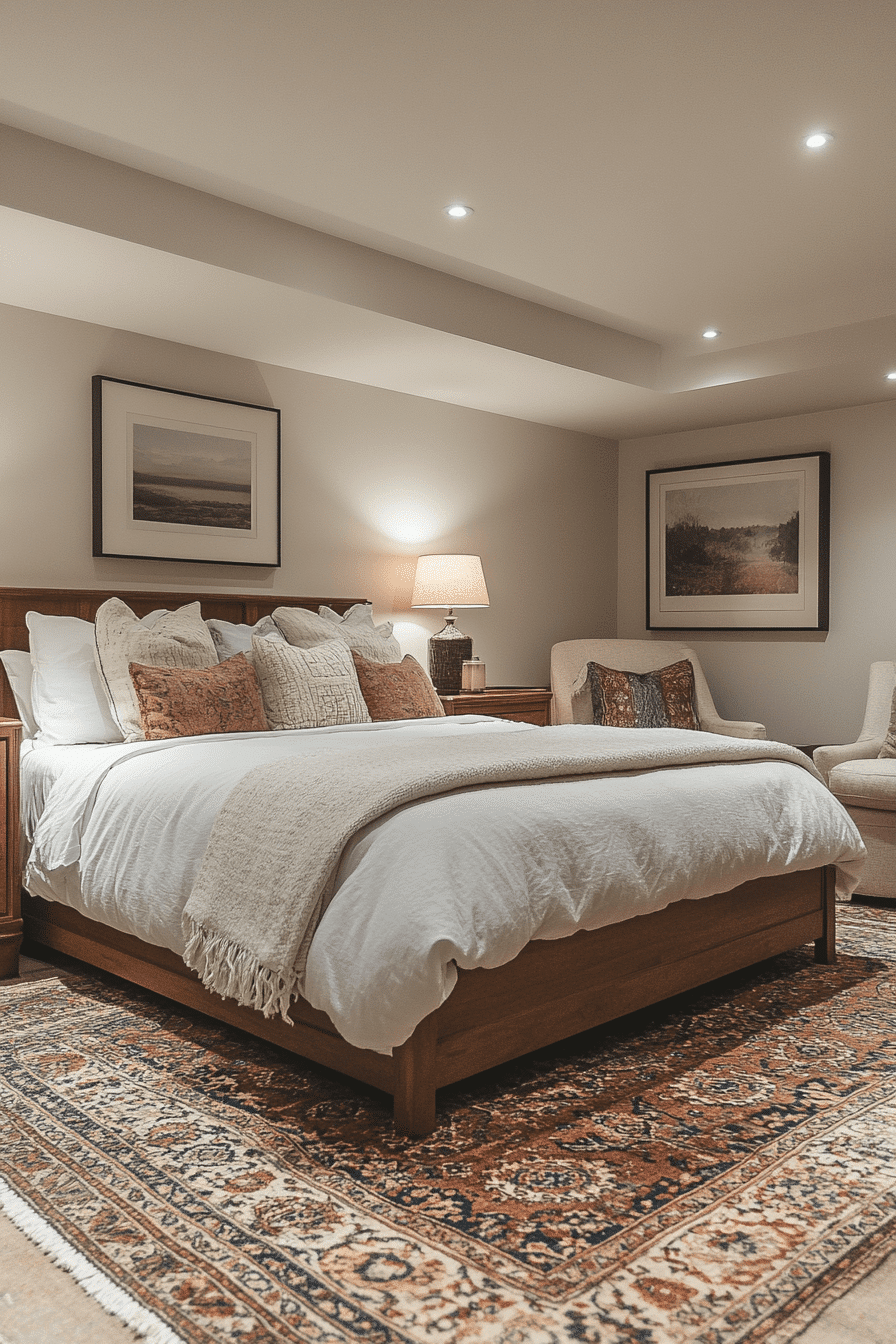 Open layouts define spacious basement bedroom ideas that feel inviting. Neutral colors with simple furniture maximize floor space. Strategic lighting adds brightness and depth. A mix of large rugs and statement furniture anchors the design. Wall art adds personality without overcrowding the space. Tap here to explore more spacious basement bedroom setups.