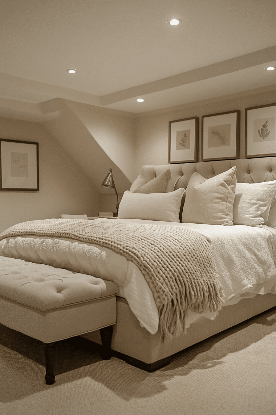 Soft aesthetics are charming basement bedroom ideas for those who want comfort. Gentle tones like cream and blush make the space serene. Textured throws and pillows enhance coziness. Subtle wall art adds personality. Neat organization keeps the look professional. Click here to explore soft basement aesthetic inspirations.