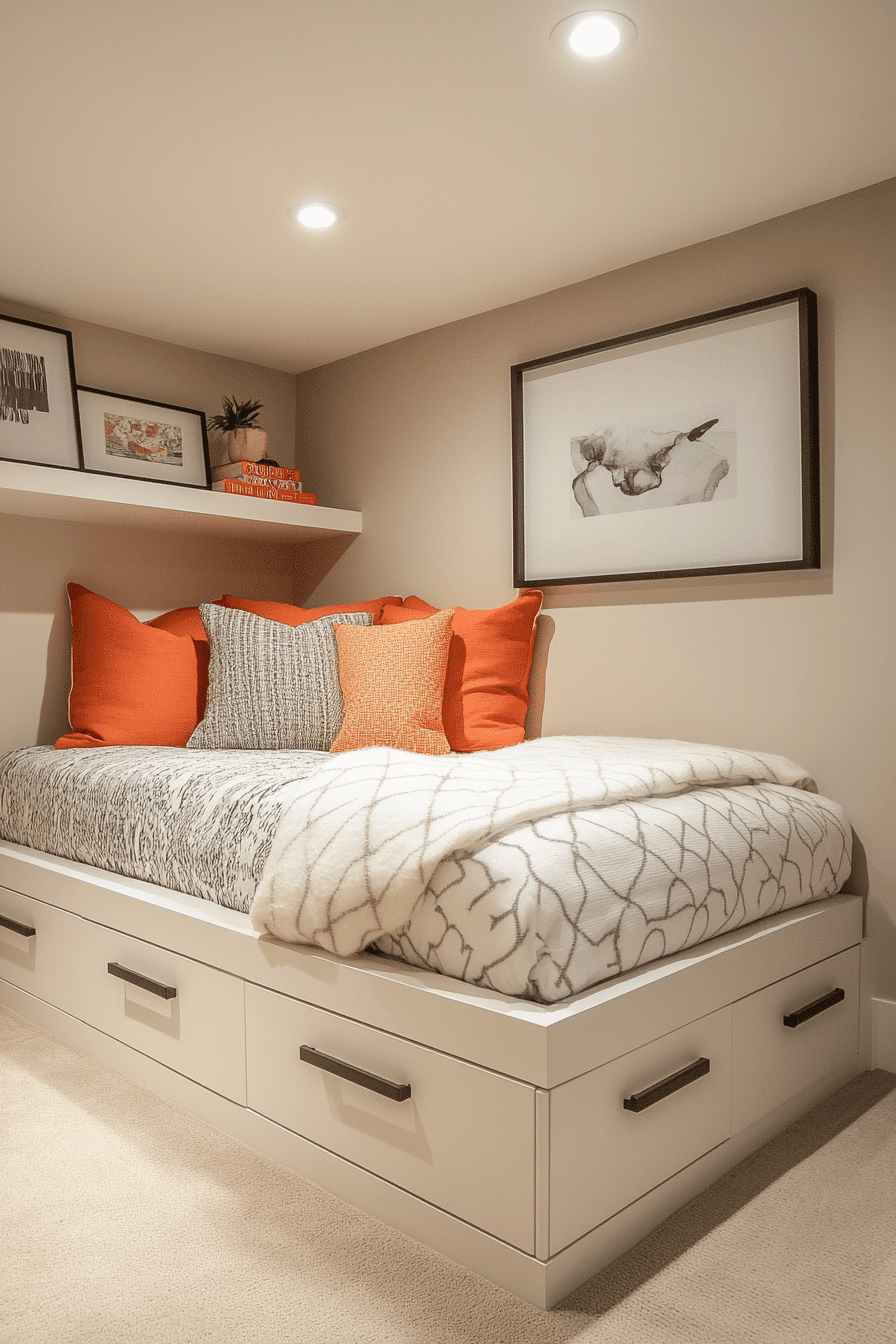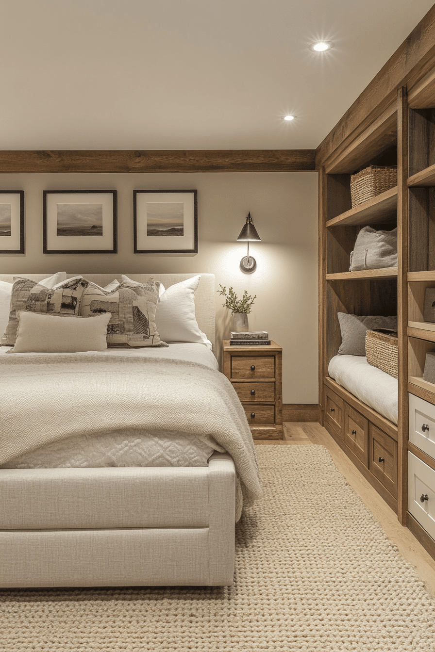 Compact sleeping nooks are creative basement bedroom ideas for maximizing small areas. Built-in alcoves provide privacy while saving floor space. Soft cushions, layered bedding, and curtains make the nook extra cozy. Neutral tones paired with simple lighting enhance the snug atmosphere. Shelving or small drawers add functionality. Click here to discover more clever basement sleeping nook inspirations.