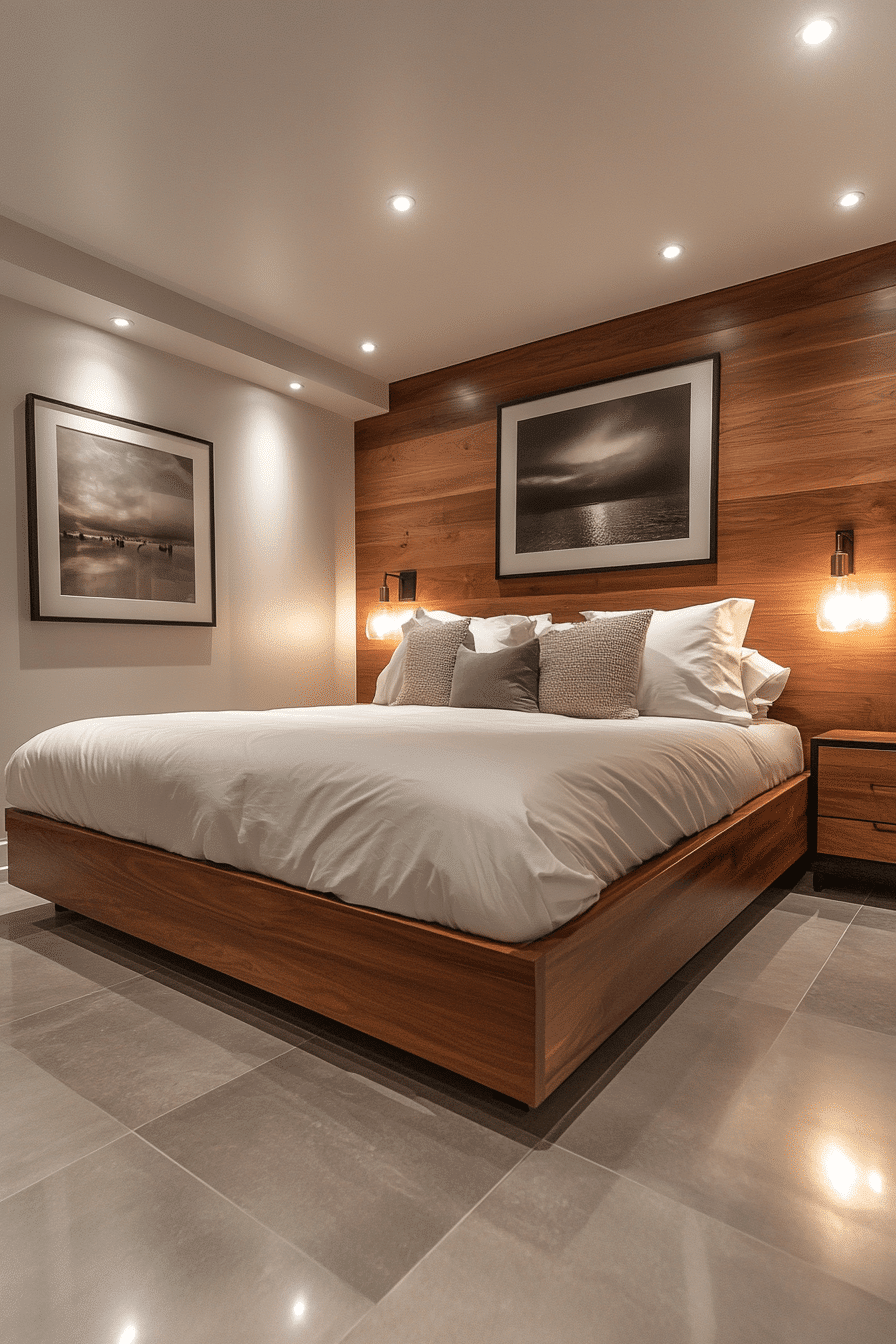 Modern layouts are trending basement bedroom ideas because they bring sleek elegance to underground spaces. Clean lines and minimal furniture make the room look spacious and stylish. Bold accent walls or artwork can add character without clutter. Layered lighting provides both ambiance and practicality. A mix of textures like wood, glass, and fabric balances the modern theme. Tap here to see more modern basement retreat inspirations.
