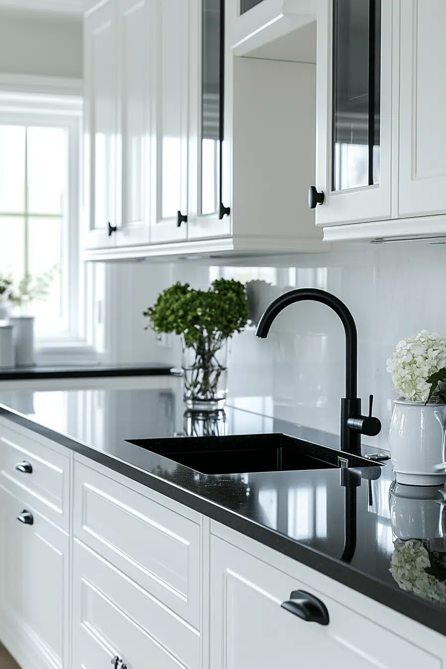 Silhouette and Satin Setup: Silhouette and Satin Setup uses satin black finishes to provide a subtle sheen that contrasts beautifully with crisp white silhouettes of cabinetry and fixtures. This combination offers a touch of luxury without the overwhelming shine of gloss finishes. The satin surfaces provide a depth that enhances the sculptural qualities of the kitchen fixtures, making them stand out against the simpler white backgrounds. This kitchen design is perfect for those who appreciate the beauty of subtle contrasts and refined textures.