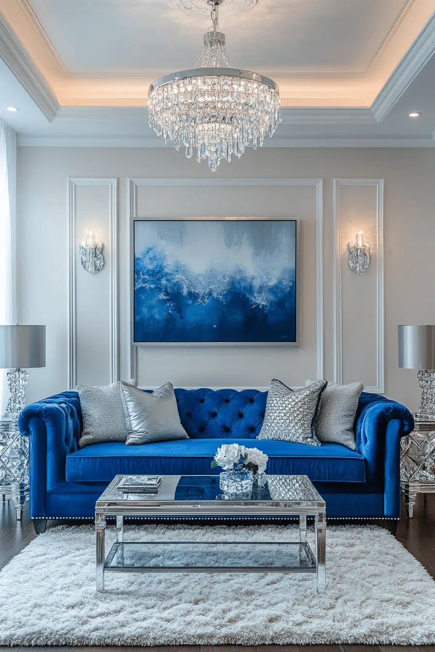 An azure blue couch provides a splash of elegance in this lounge, paired with soft silver accents and crisp white walls for a classic look. Luxurious textures such as silk cushions and velvet throws make the space inviting and sophisticated. This setting is ideal for those who appreciate a blend of modern chic and timeless elegance. A crystal chandelier and ornate mirror add a final touch of glamour.