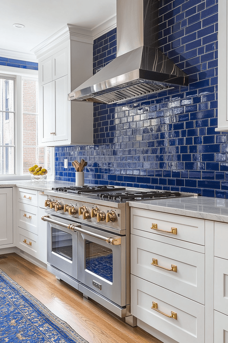 Cobalt blue tile backsplash kitchen delivers energy and confidence in every tile. This striking hue pairs well with white or charcoal cabinets, creating instant contrast. Cobalt tiles have a way of making the kitchen feel bold and luxurious at once. Whether you use small or oversized tiles, the look feels powerful. It’s a perfect choice for homeowners who love high-impact design. Click to explore cobalt blue backsplash ideas full of personality!