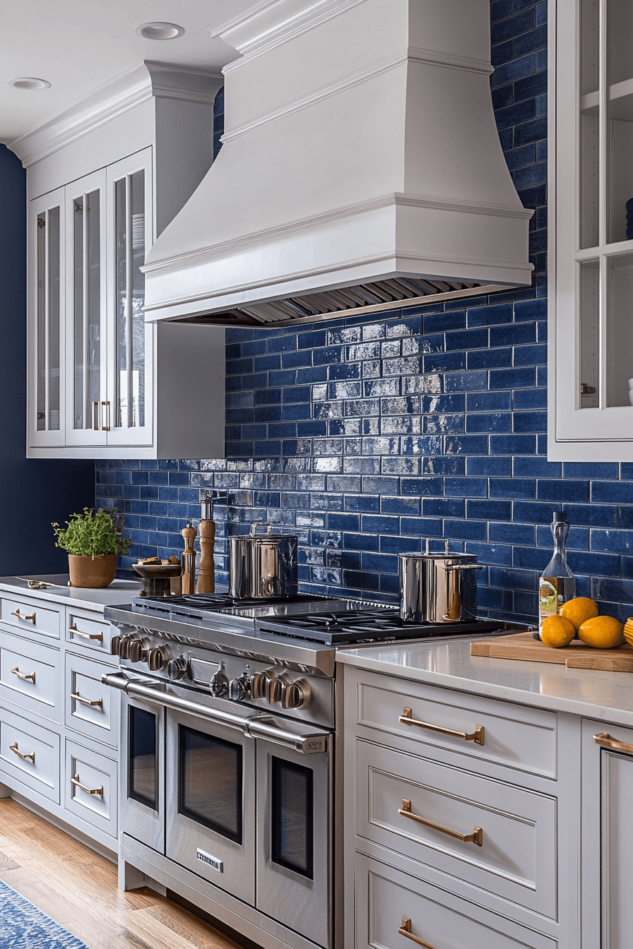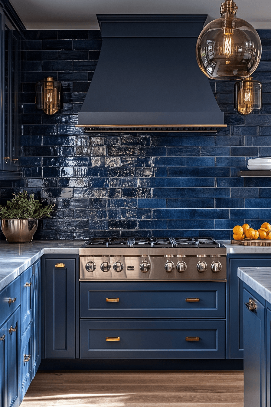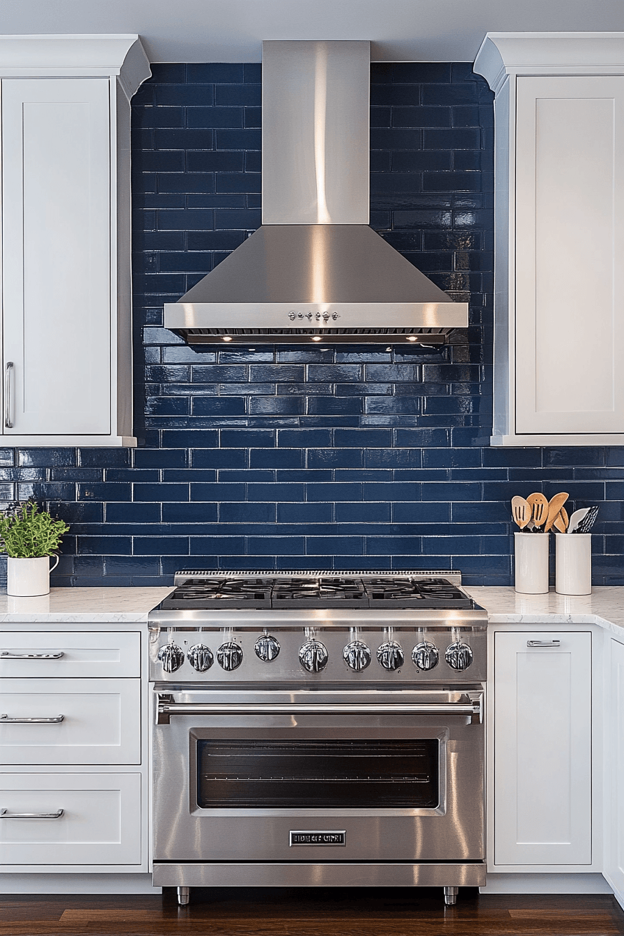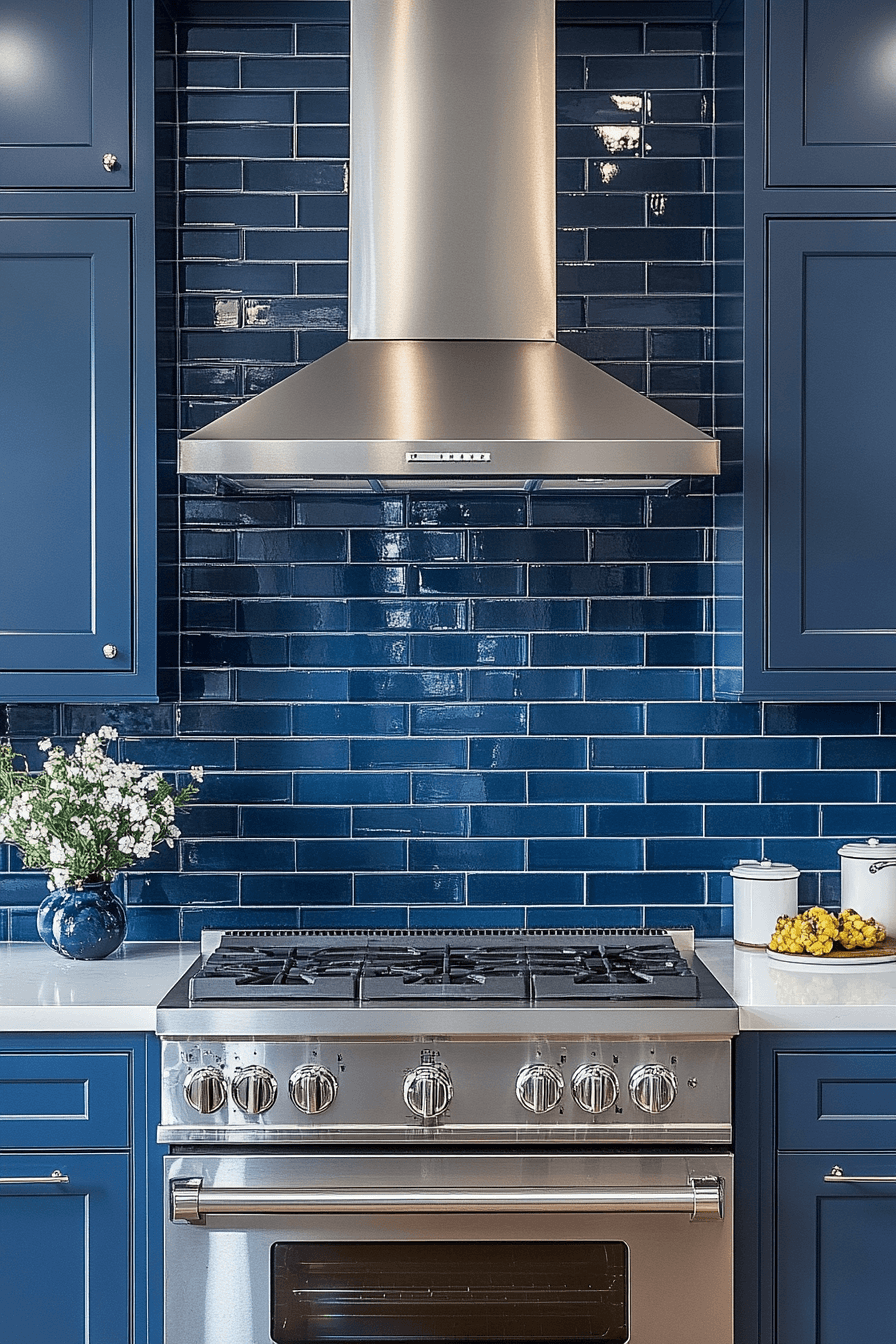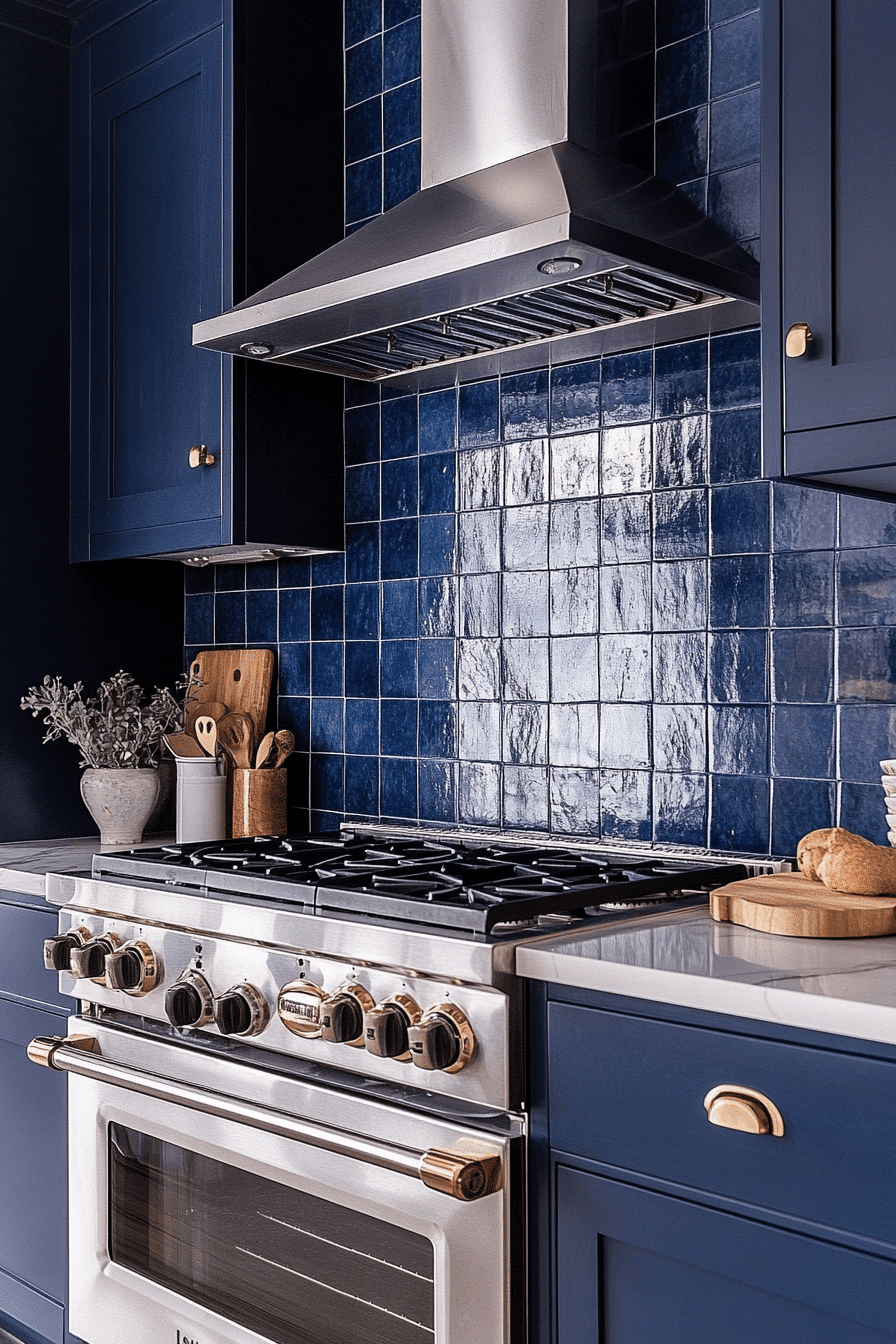 A deep navy blue tile backsplash kitchen offers sophistication and depth, perfect for modern and transitional designs. The dark blue adds a grounding element, especially when paired with brass hardware or light counters. This look feels bold without being overwhelming, offering timeless appeal. Navy tiles with a glossy finish reflect subtle light for added interest. They work beautifully in both compact and spacious kitchens. Discover more deep navy backsplash designs that add instant elegance!