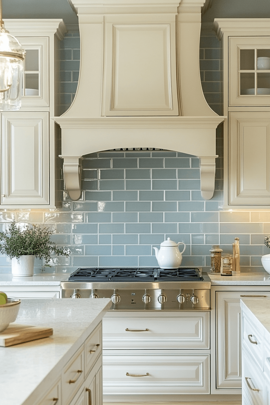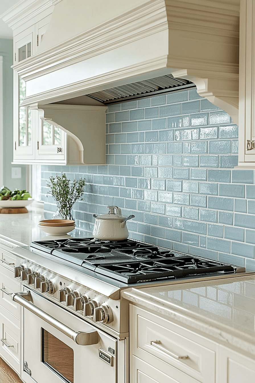Sky blue tile backsplash kitchen evokes a sense of calm and airiness, ideal for open-concept layouts or smaller kitchens. This soft hue pairs beautifully with natural wood accents or marble countertops. The color reflects the peacefulness of the outdoors, bringing tranquility inside. Use sky blue in larger tiles for a minimal vibe or small mosaics for a textural effect. It’s an easy way to refresh your space while keeping things light and breezy. Explore sky blue backsplash styles that make kitchens feel like home!