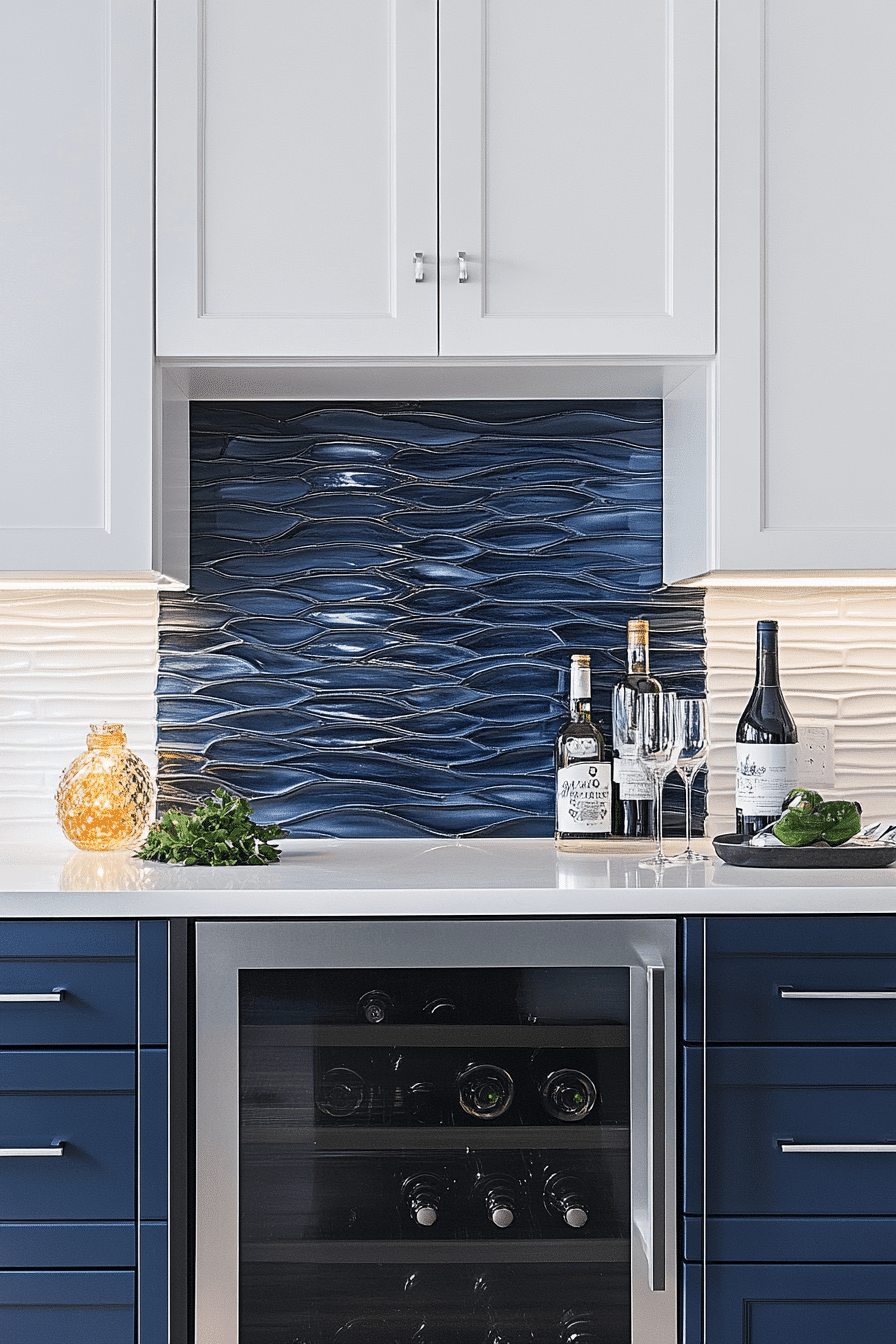 Navy and white tile backsplash kitchen delivers crisp contrast and modern charm. This classic pairing is elevated by the sheen and structure of glass or ceramic tiles. Navy tiles add depth while white keeps the look balanced and clean. This design works well in both contemporary and coastal interiors. It’s a high-impact combination that still feels timeless. Discover navy and white backsplash pairings that strike the perfect tone!