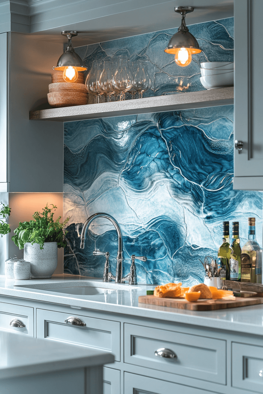 An ocean-inspired blue tile backsplash kitchen brings the serenity of the sea into your cooking space. Tiles in tones like turquoise, teal, and sky blue blend together for a soothing, layered look. The watery color palette pairs well with white countertops and silver fixtures. This backsplash style is perfect for brightening up your kitchen without overwhelming it. It’s fresh, tranquil, and totally unique. Tap here for backsplash ideas that flow with ocean beauty!