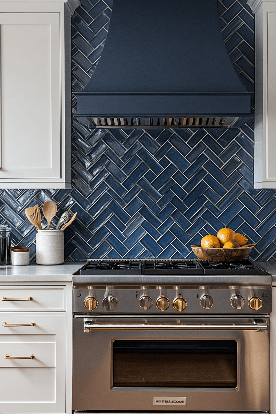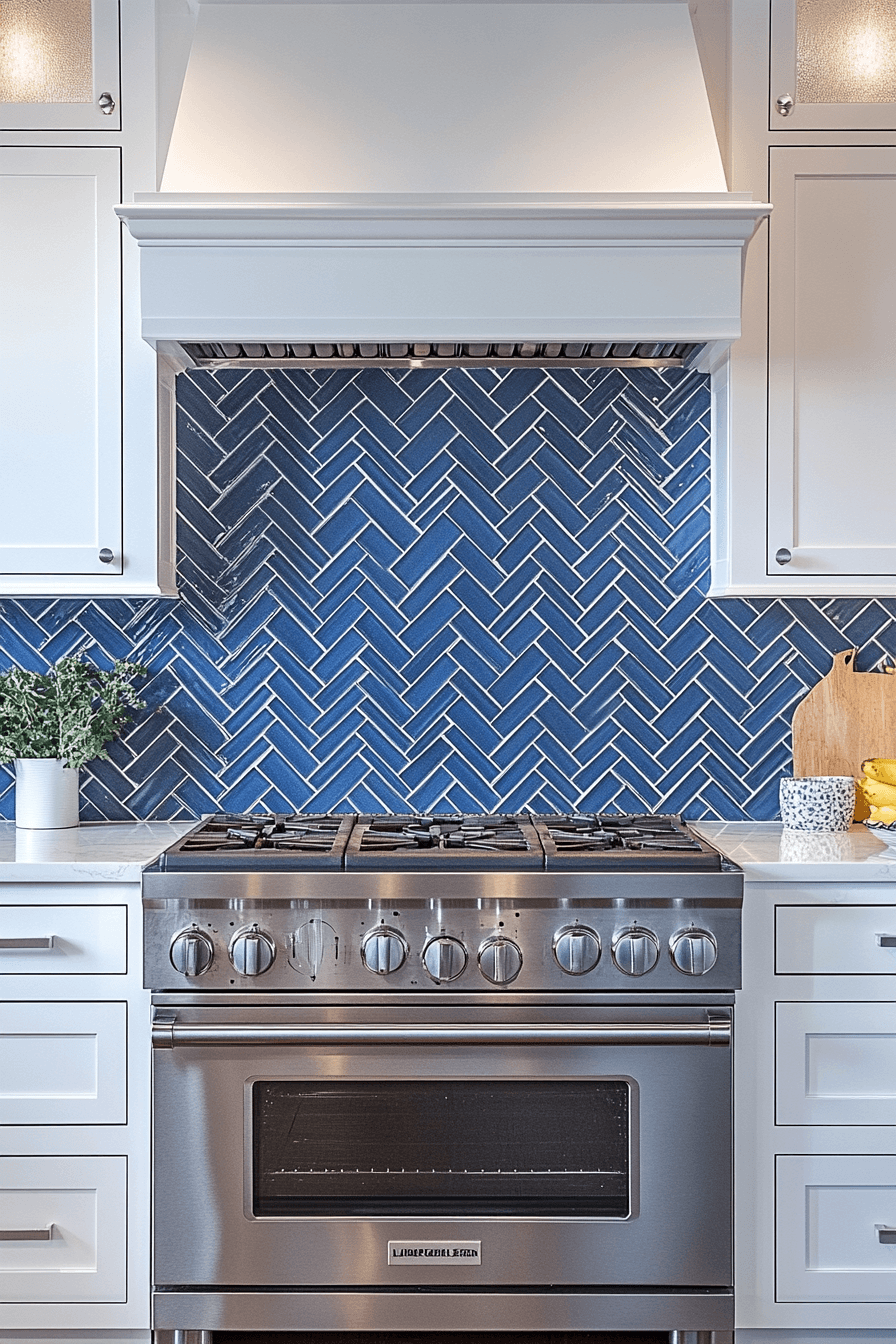 A blue tile backsplash kitchen in a herringbone layout adds instant texture and movement. This pattern turns a simple backsplash into a stylish design feature. Whether using deep navy or soft aqua, the diagonal layout draws the eye upward and across. It’s a sophisticated twist on traditional tiling that works well in modern and transitional kitchens. The pattern also complements sleek counters and minimal cabinetry. Explore herringbone backsplash ideas that bring bold blue flair!