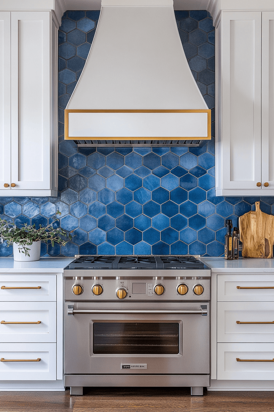 Blue tile backsplash kitchen with hexagon tiles adds a trendy yet timeless geometric flair. These honeycomb shapes catch the light in unexpected ways, adding both shine and interest. Use a single shade of blue or mix a few for a playful gradient. Hex tiles work beautifully in contemporary or transitional kitchens. They provide subtle complexity without overwhelming the eye. Tap here for blue hex backsplash ideas that break the mold!