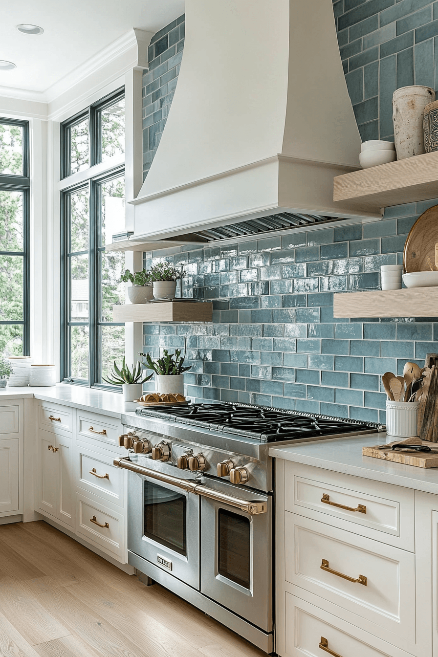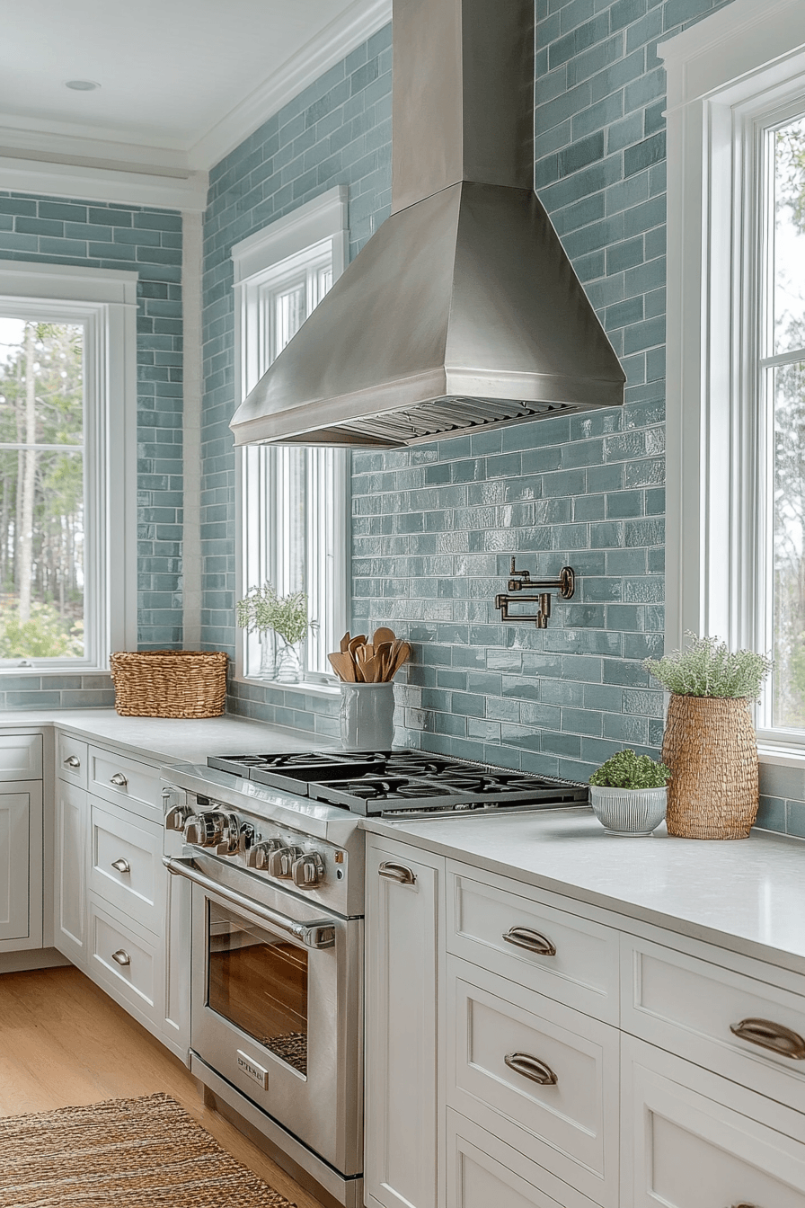 Coastal blue tile backsplash kitchen evokes breezy ocean vibes and effortless charm. Soft blue hues reflect natural light, making the kitchen feel brighter and more spacious. These tiles blend beautifully with sandy countertops or whitewashed cabinets for a beach-inspired palette. The finish can range from glossy to matte, depending on the mood you want to create. It’s a refreshing choice that brings serenity into your cooking space. Tap here for more coastal blue backsplash inspiration that feels like a seaside escape!
