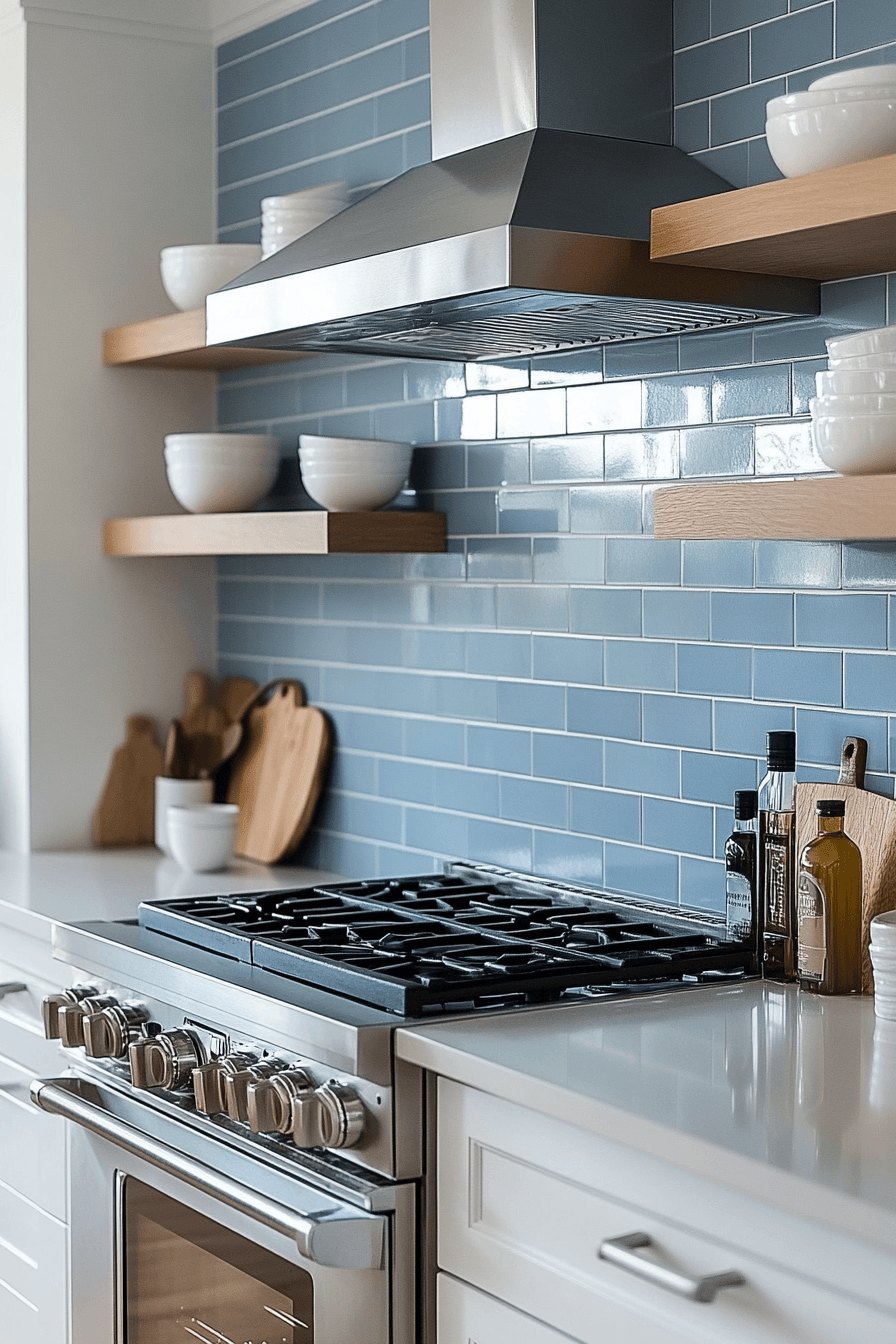 Minimal blue tile backsplash kitchen focuses on simplicity, letting the color take center stage. Smooth, flat tiles in a calming blue create a serene, unfussy backdrop. This design is perfect for homeowners who want a subtle statement without visual clutter. Use it behind the range or across the full wall for maximum impact. The minimal look is soothing and polished, ideal for clean design aesthetics. Tap here for more minimal blue backsplash ideas that feel fresh and modern!