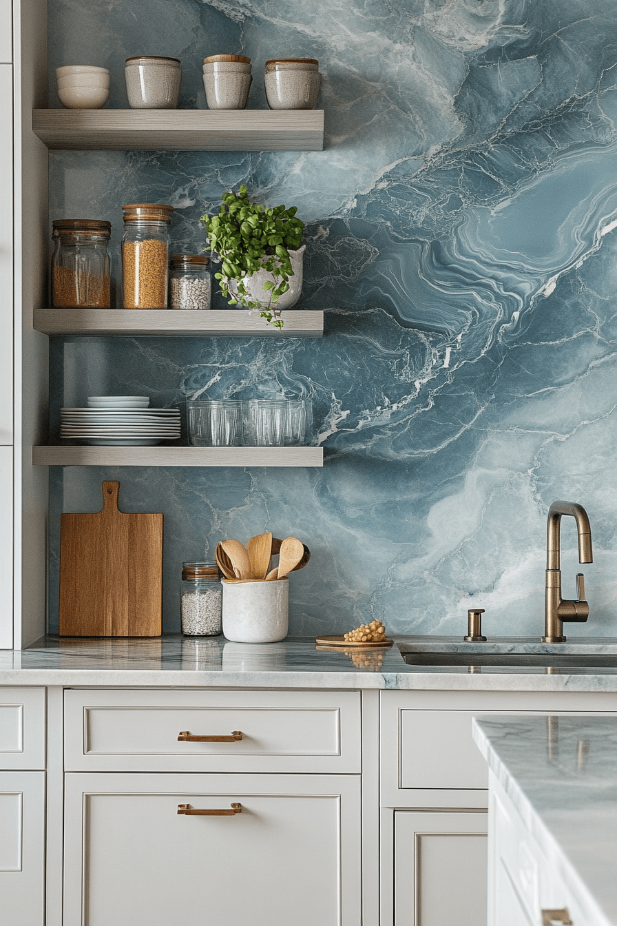 A marble-effect blue tile backsplash kitchen blends the best of color and texture for an elegant, upscale look. These tiles mimic natural stone while incorporating soft blue veining or washes. They pair beautifully with white or gray counters and elevate the room with refined character. The look is sophisticated but still fresh and unique. Use it to add both visual depth and luxury. Click to discover marble-inspired blue tiles that redefine elegance!