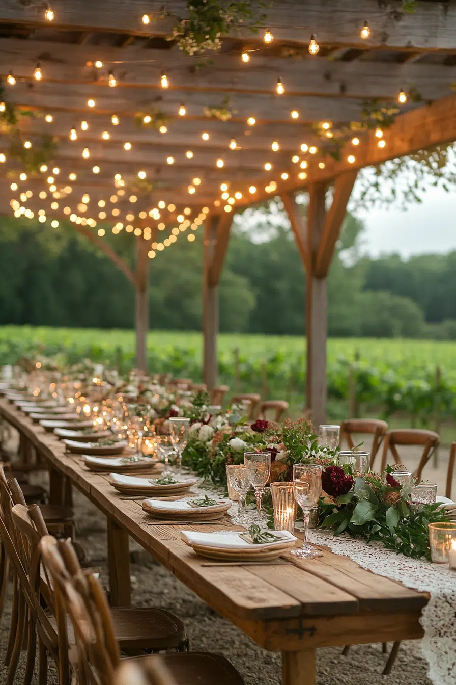 Boho Rustic Festival wedding decor is perfect for couples who want a lively, festival-like atmosphere on their big day. Think colorful flags, festive lighting, and an open-air setting that encourages dancing and celebration. Use rustic elements like wooden signs and furniture to keep the decor grounded, while adding boho touches such as vibrant tablecloths and eclectic ornaments. Plan activities and music that reflect a festival vibe, ensuring a fun, memorable experience for all your guests.