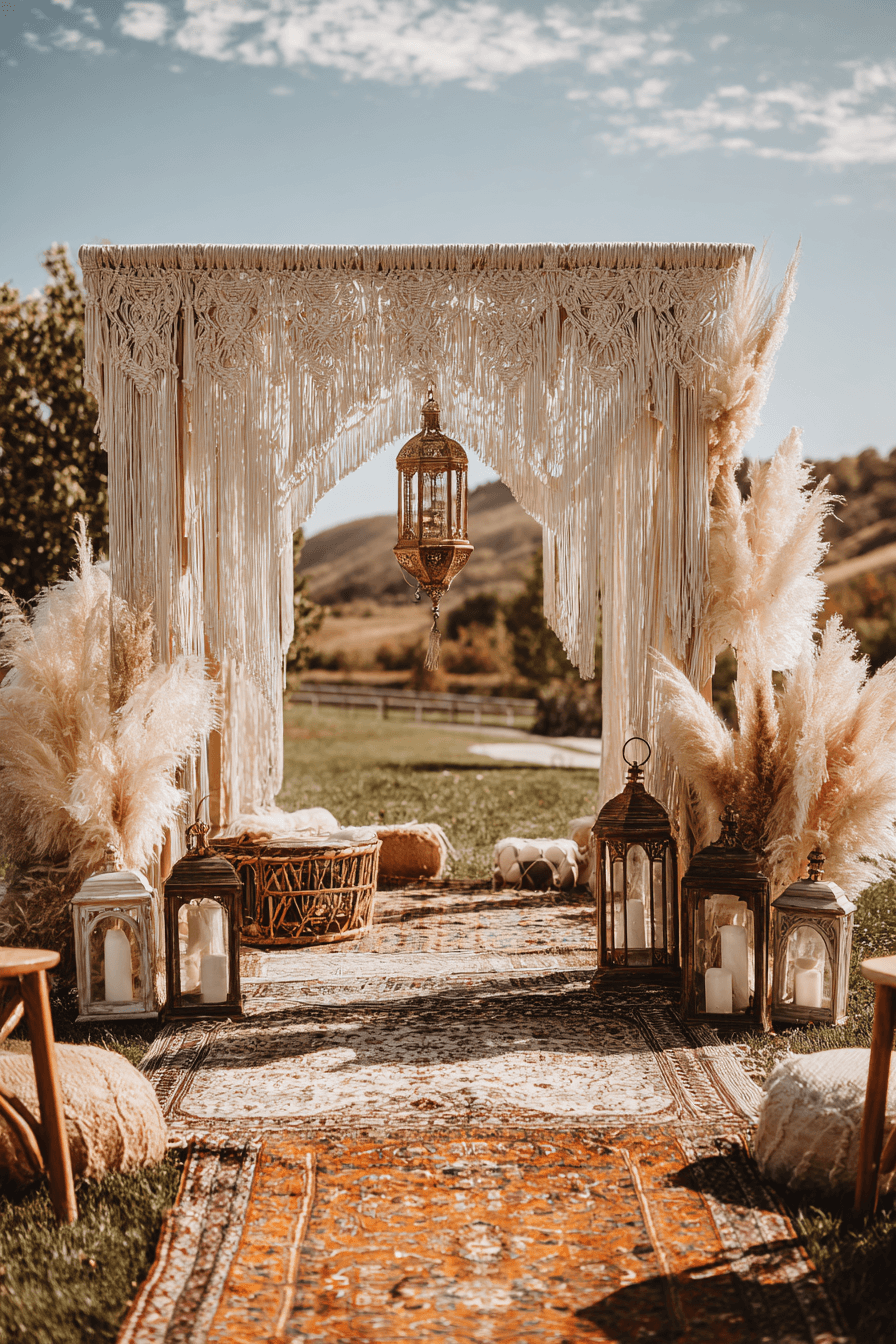 Embrace a world where lace, lanterns, and love collide in this whimsical boho wedding vision. With flowing fabrics, pampas grass, and wild blooms, the setting feels like a dreamy fairytale under the sun. Macramé backdrops and woven rugs add textured charm that’s effortlessly enchanting. The boho wedding aesthetic thrives in its ability to blend nature and artistry into every detail. This style welcomes laid-back elegance, where every element feels personal and heartfelt. Tap to uncover more dreamy ideas for your big day.