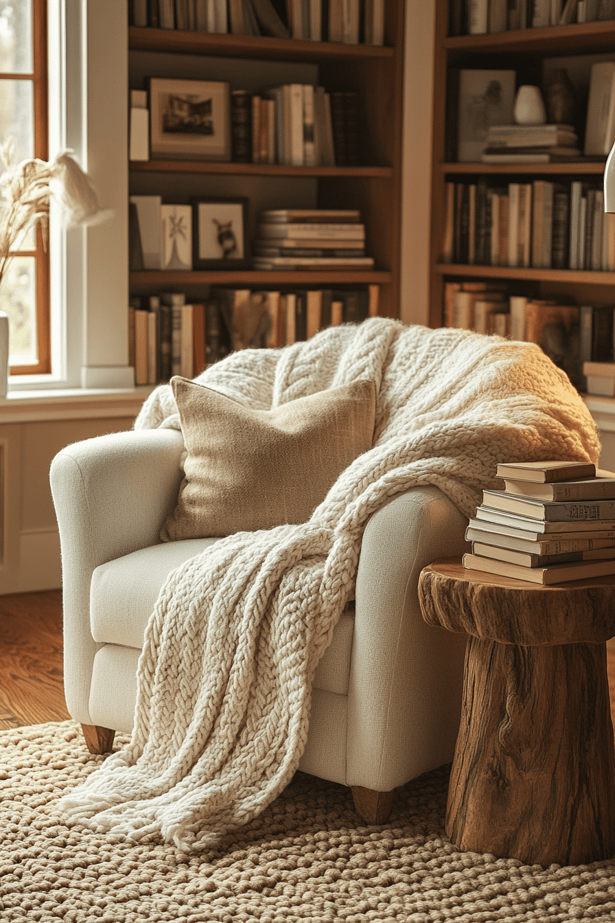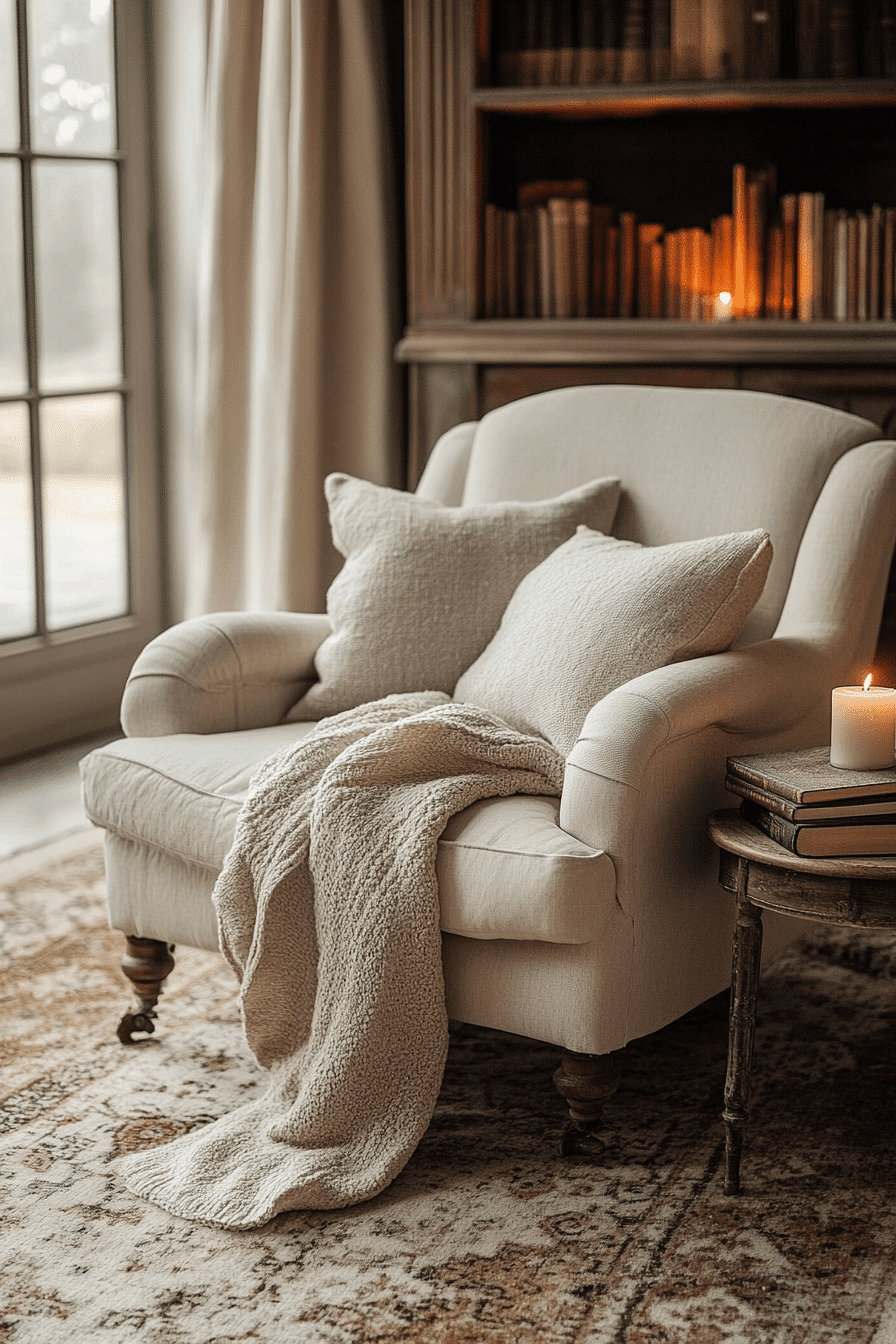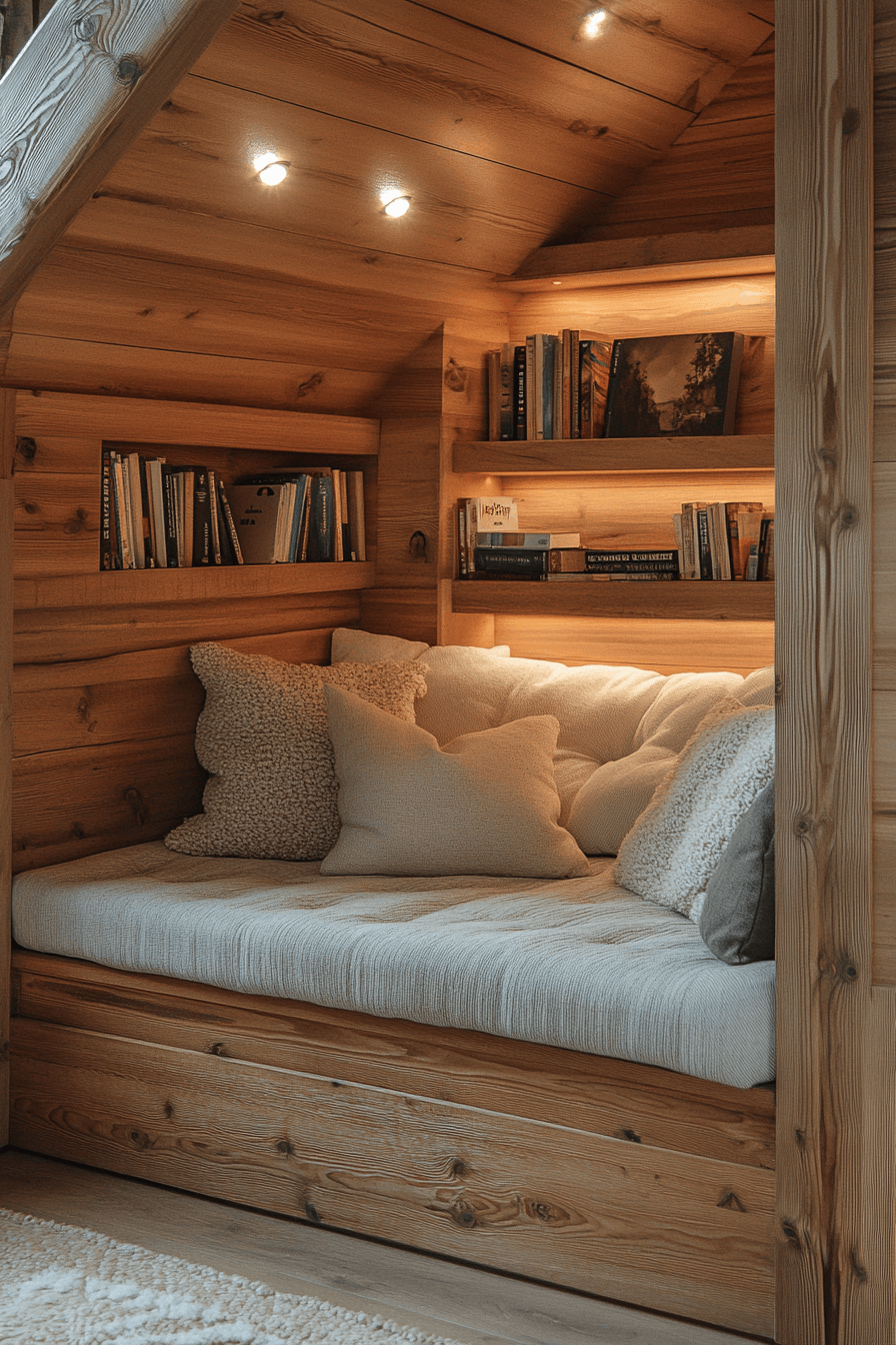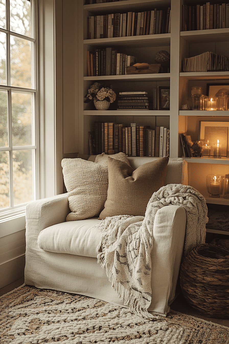 These book nook ideas are all about calm energy and cozy simplicity. A neutral palette with soft pillows and layered throws creates an inviting environment. Subtle lighting sets a peaceful tone for long reading sessions. It’s the kind of place that melts away daily stress. Every detail encourages relaxation and mindfulness. Tap here to uncover more tranquil book escape inspirations!