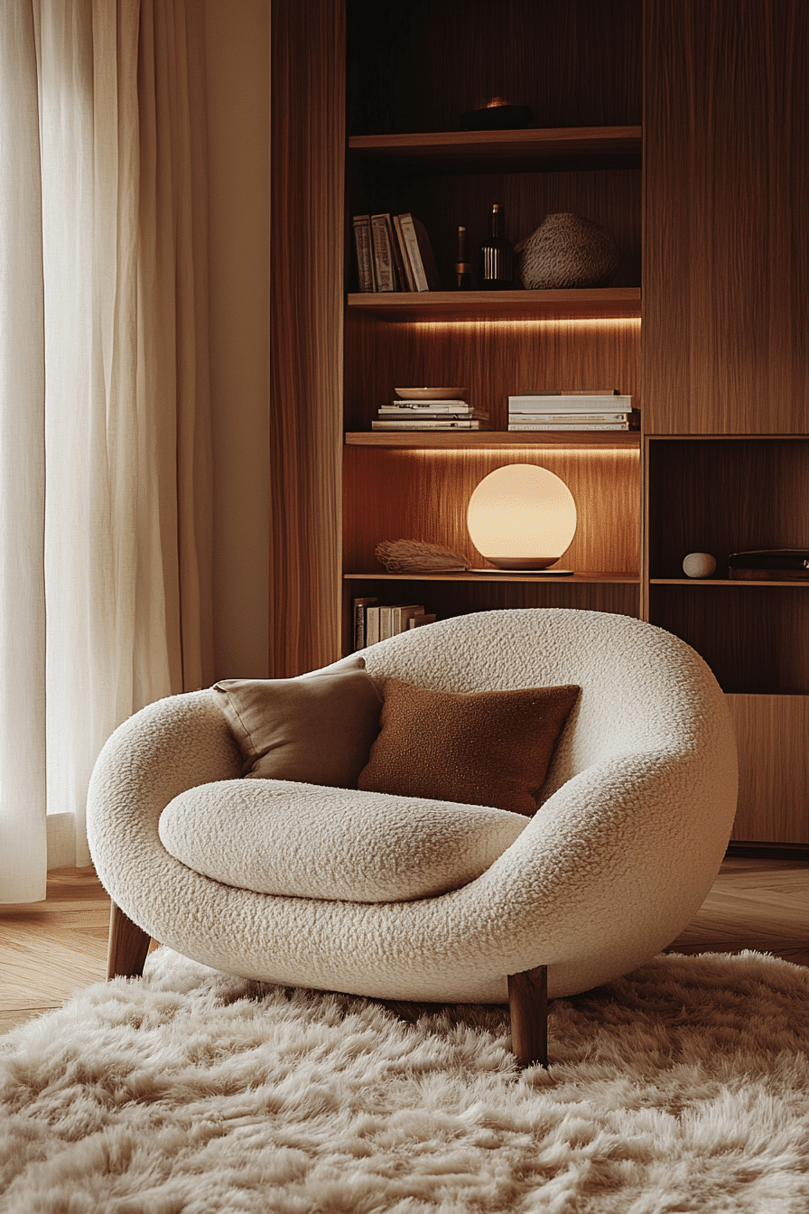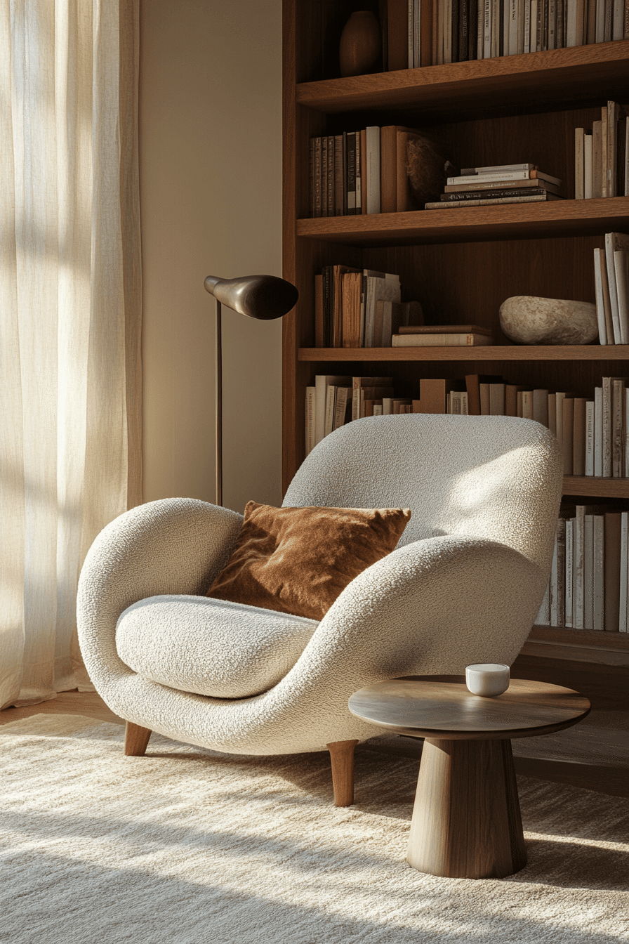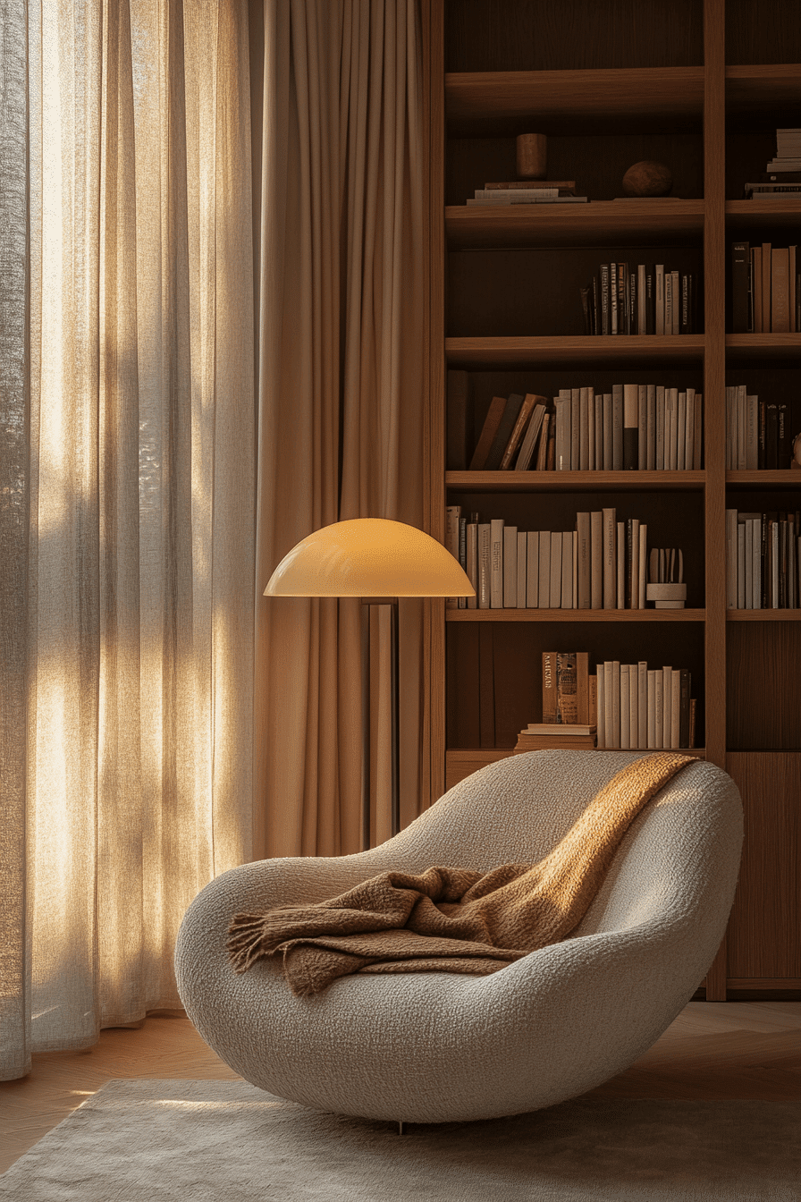 These minimalist book nook ideas celebrate simplicity and calm. A single chair, neutral rug, and gentle lighting define the aesthetic. The uncluttered layout encourages focus and comfort simultaneously. Add a few soft textures for warmth without distraction. It’s proof that less truly is more when it comes to reading joy. Click now to discover more minimal cozy corner ideas!