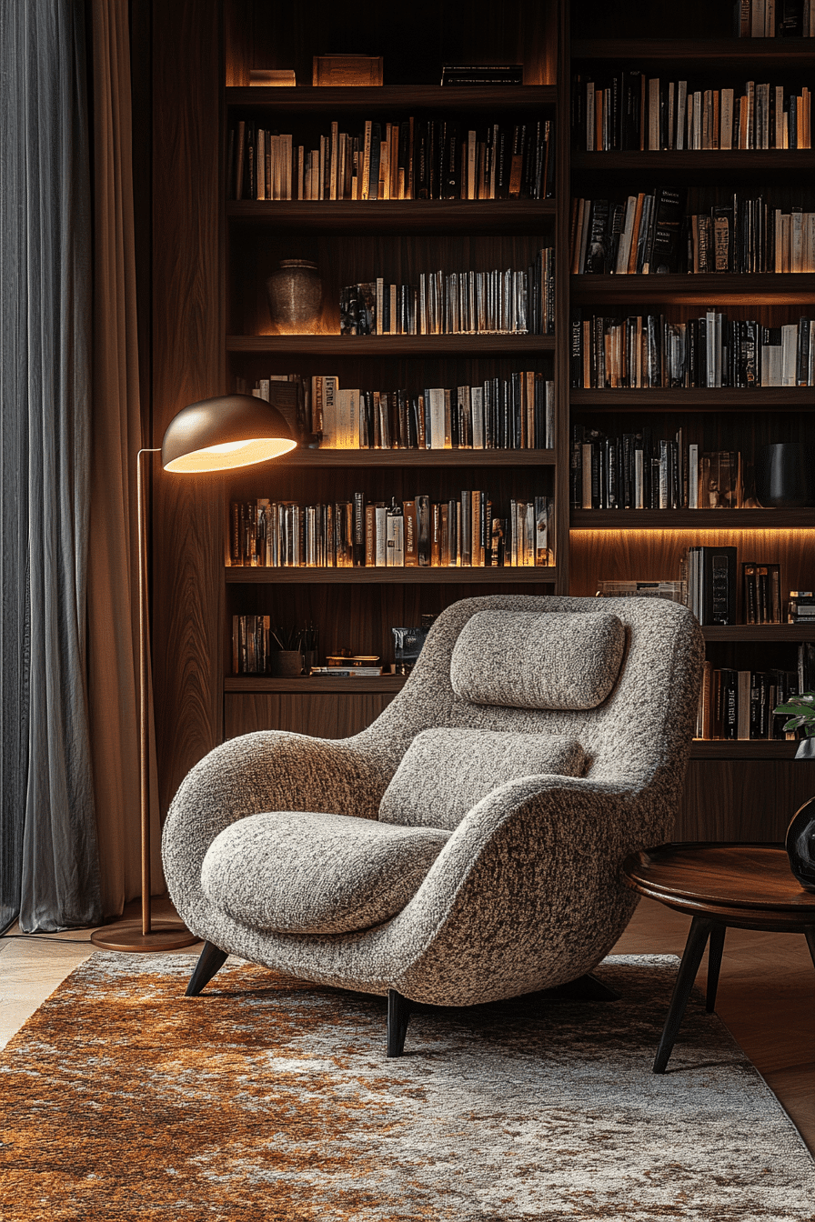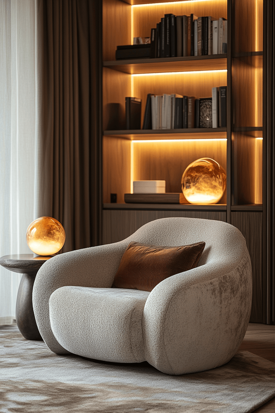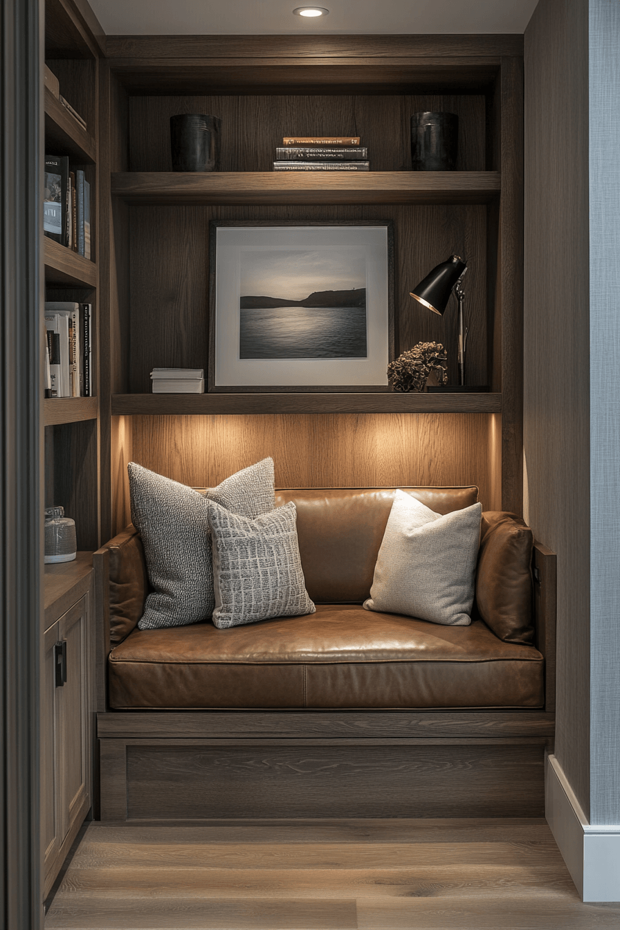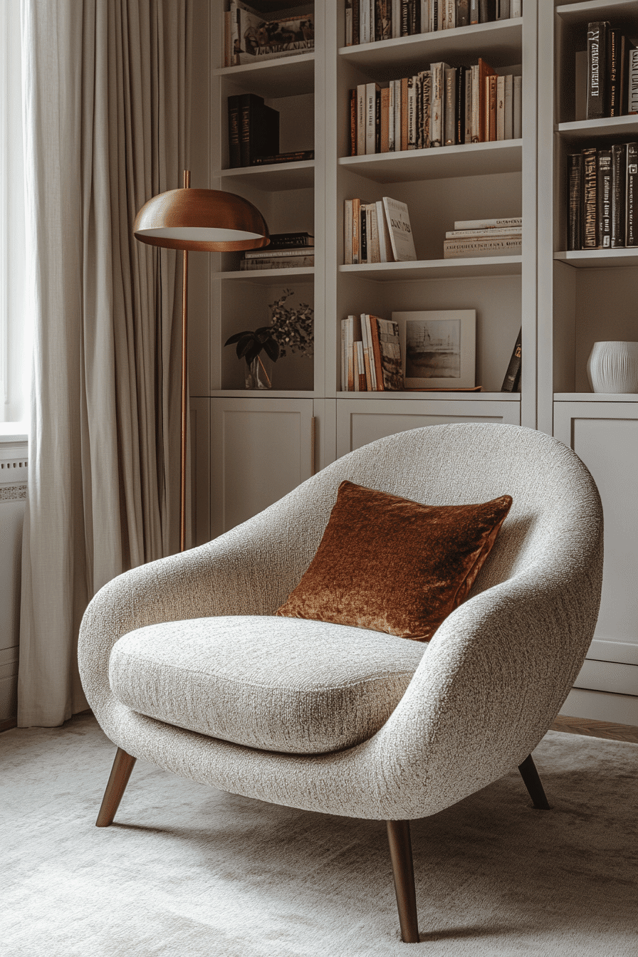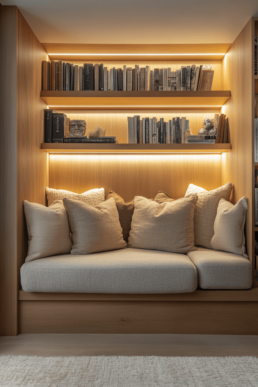 These polished book nook ideas blend modern aesthetics with cozy elements. Clean lines meet plush textures for balanced harmony. A neutral color scheme enhances the tranquil mood. It’s sophisticated without feeling cold or distant. You’ll love how functional and inviting it feels. Click now to explore more modern book sanctuary designs!