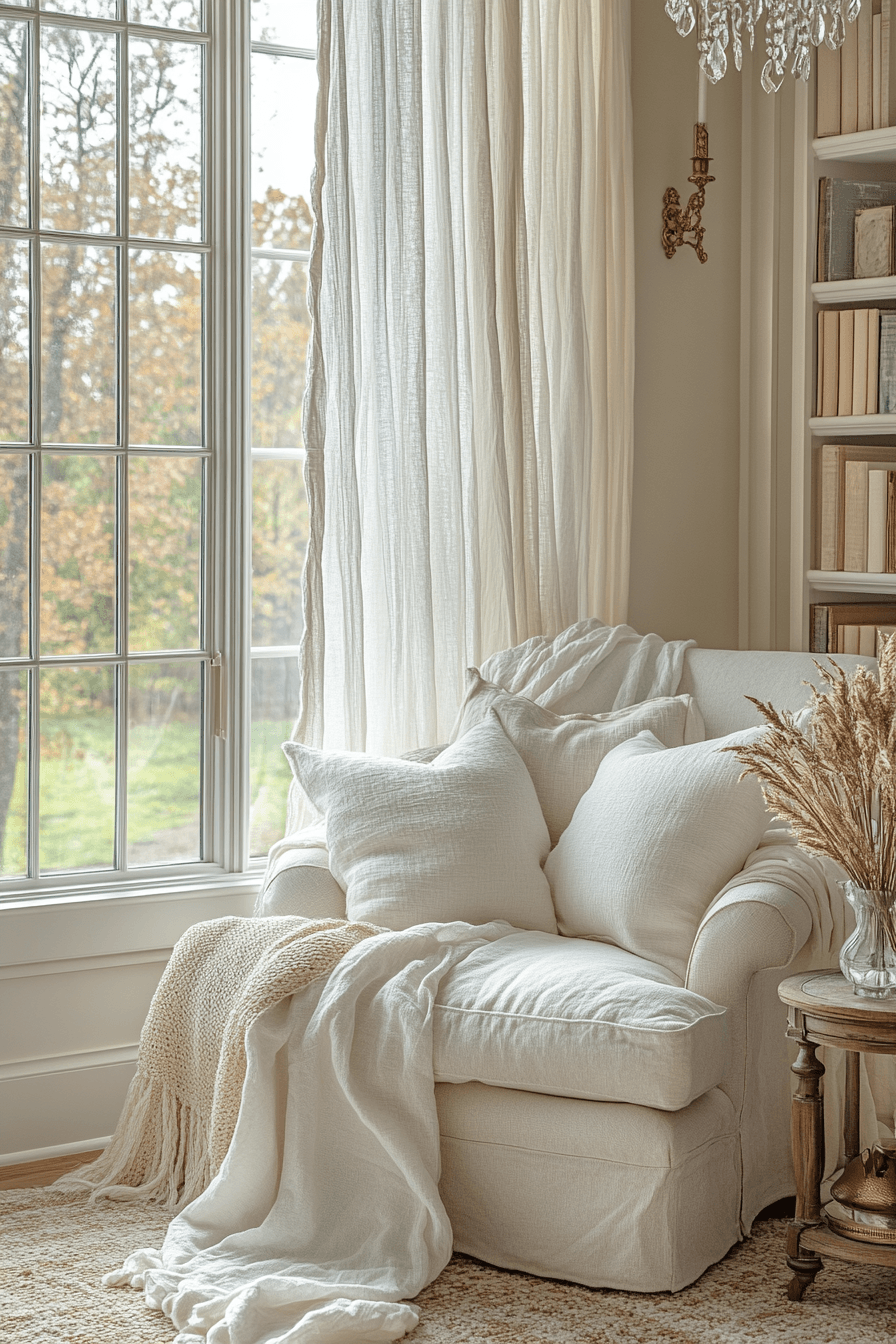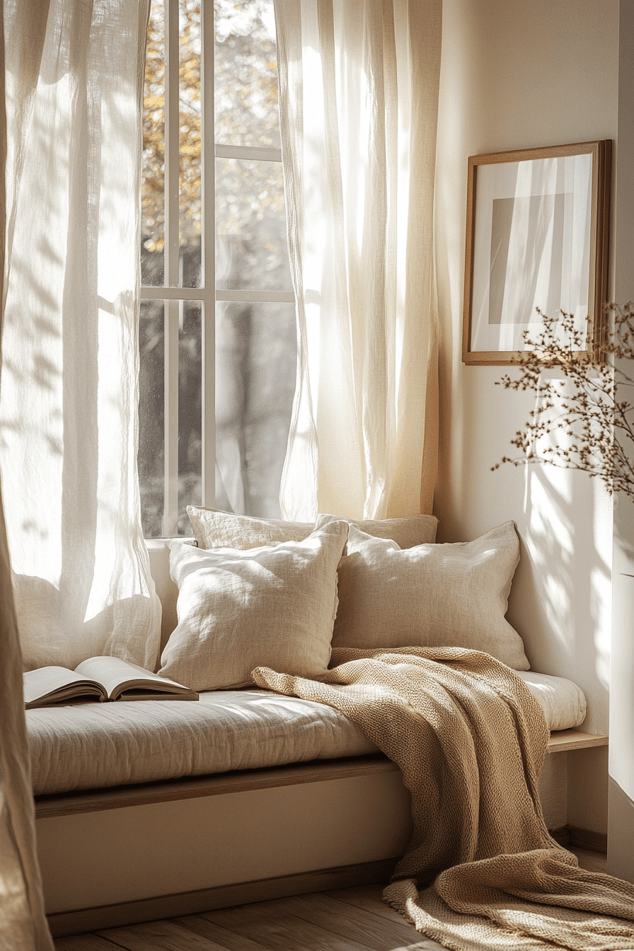 These joyful book nook ideas combine softness and symmetry. Natural light, airy fabrics, and plush cushions create balance. The layout feels open yet comforting. It’s a space where time seems to pause while you read. Add a side shelf for your favorite titles to enhance accessibility. Tap to discover more blissful book space ideas!