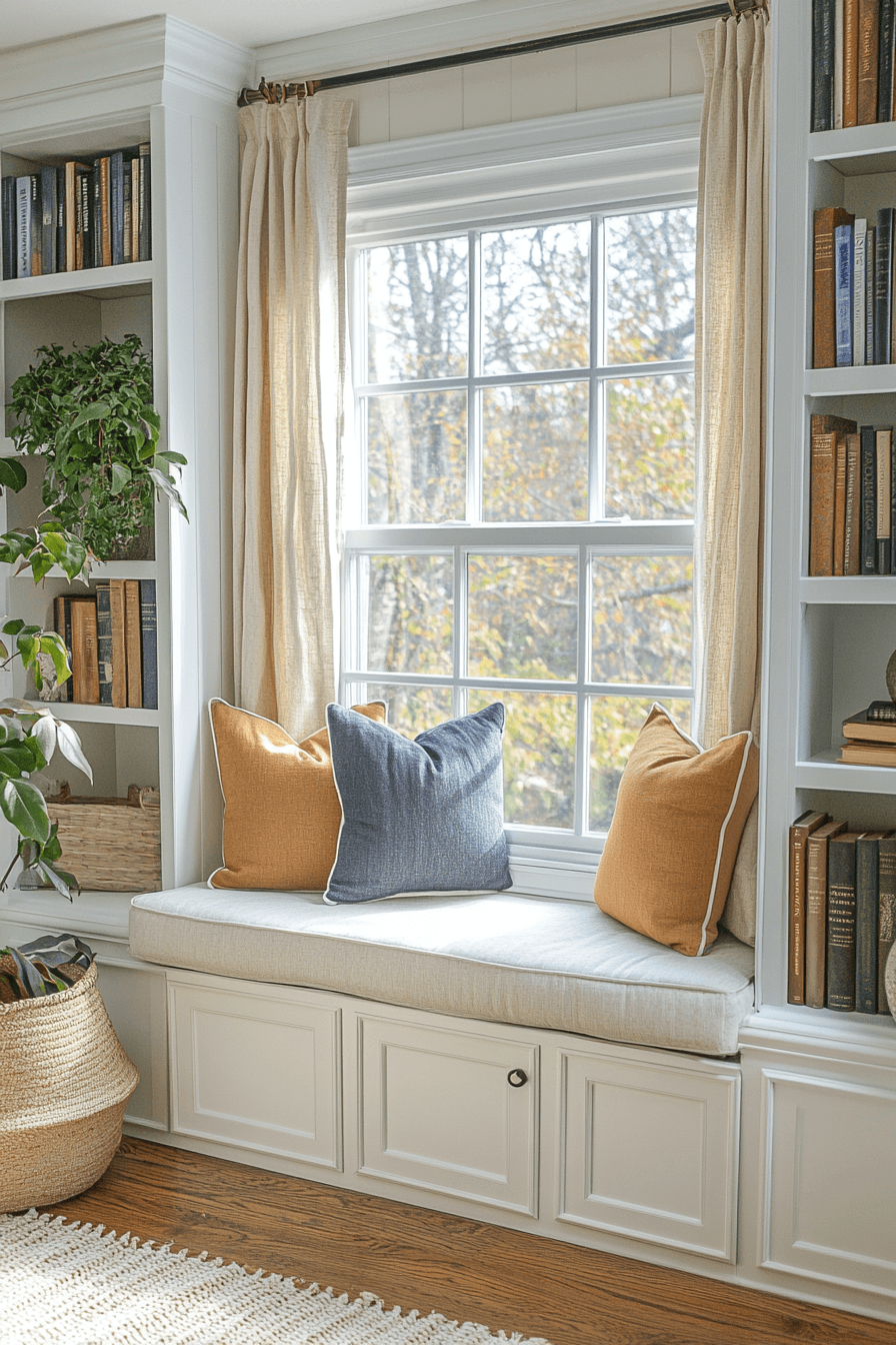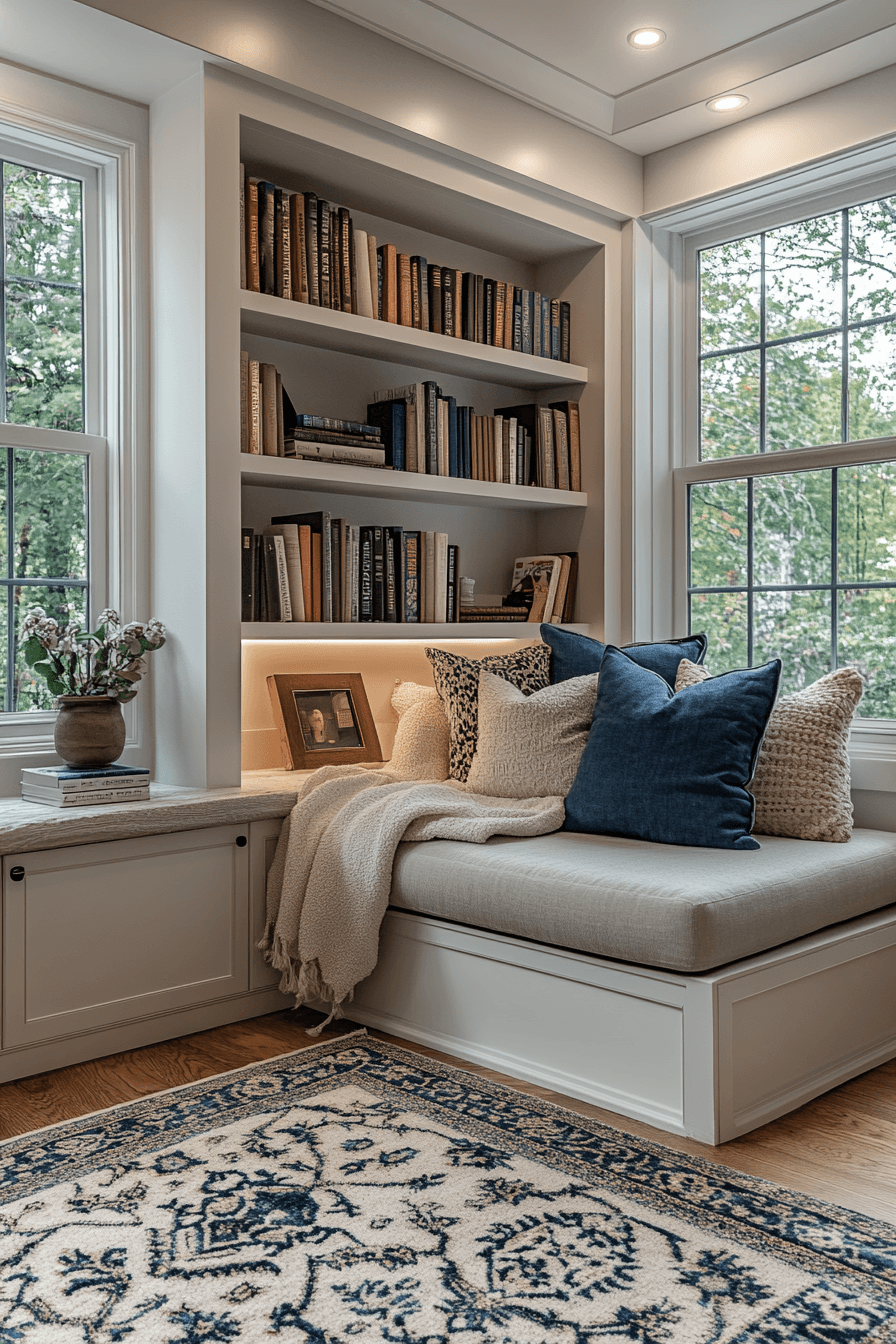 These book nook ideas focus on serenity and balance, blending soft textiles and soothing tones for total relaxation. A cushioned bench near a window transforms into your private reading sanctuary. Soft throws and layered lighting add dimension while keeping things comfortable and bright. It’s the perfect setup for quiet mornings or rainy afternoons with your favorite book. Every element encourages you to slow down and enjoy the moment. Click now to uncover more reading bliss book nook ideas!