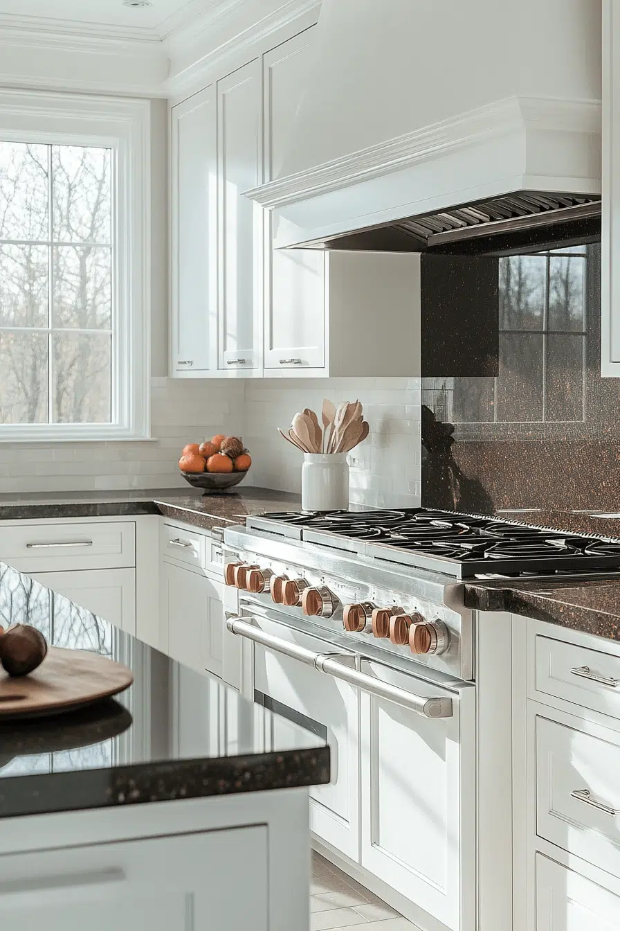 Sleek Espresso brown granite countertops bring dramatic depth to any kitchen design. Their almost-black base with hints of dark brown creates a high-contrast look that feels refined and bold. Pair them with white or light grey cabinets for maximum impact. This countertop style works beautifully with chrome or brushed nickel accents. The smooth polish enhances the luxe aesthetic.