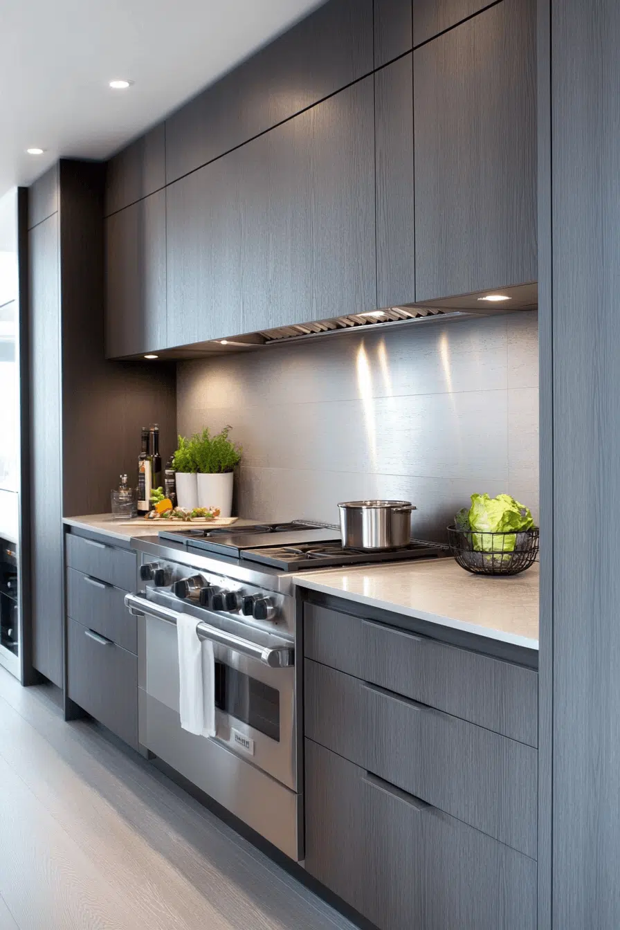 Charcoal kitchen cabinets are ideal for a bold minimalism approach, offering visual impact without clutter. Their matte or satin finish adds depth without distracting from the clean lines. This design thrives on simplicity, using thoughtful contrast with white walls or light countertops. The result is a space that feels open, confident, and balanced. Minimal hardware or handle-free doors enhance the streamlined look.