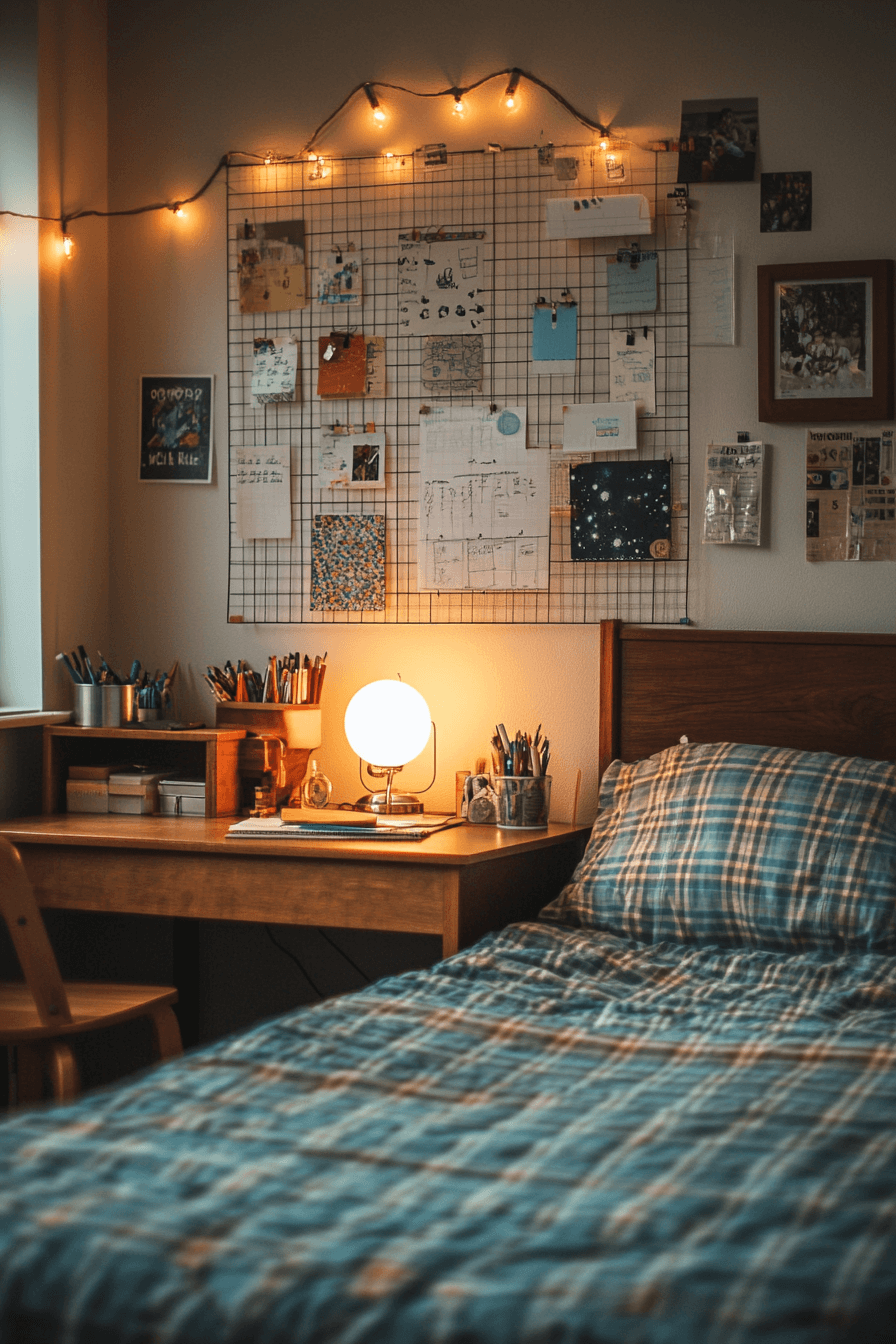 A wall grid above a desk keeps study areas stylish and efficient. It provides space for notes, reminders, or décor. These college dorm room ideas make study corners both fun and functional. Pair with sleek lighting for added focus. The look is modern and organized. Click here to explore more wall grid college dorm room ideas.
