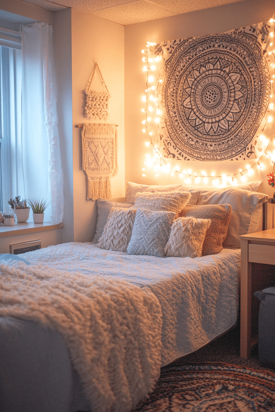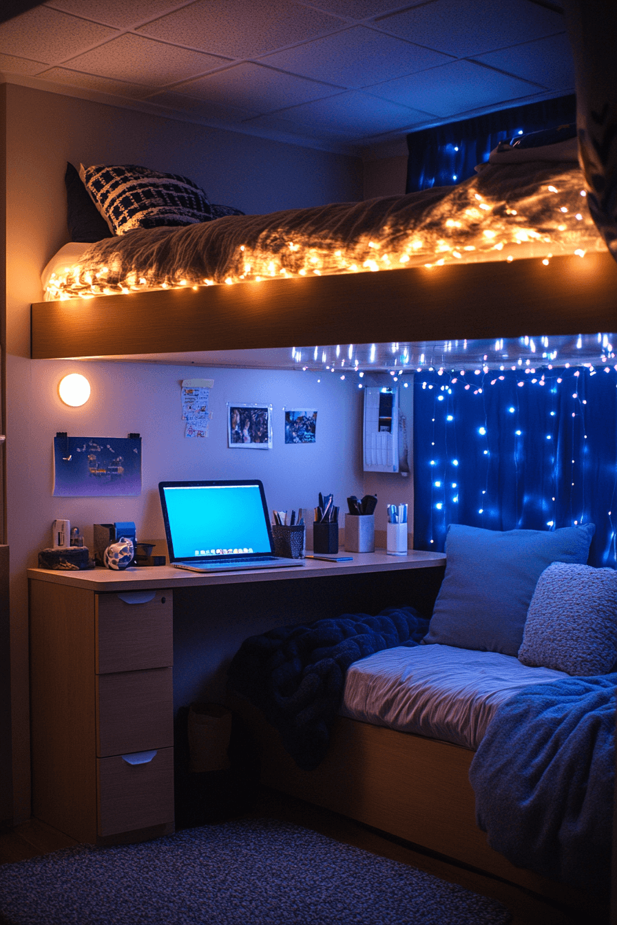 Fairy lights add instant charm and coziness to any dorm. They make the space feel magical and warm. These college dorm room ideas are affordable and trendy. String lights across walls or bed frames for a dreamy effect. The glow creates a relaxed, fun vibe. Click now to discover more fairy light college dorm room ideas.