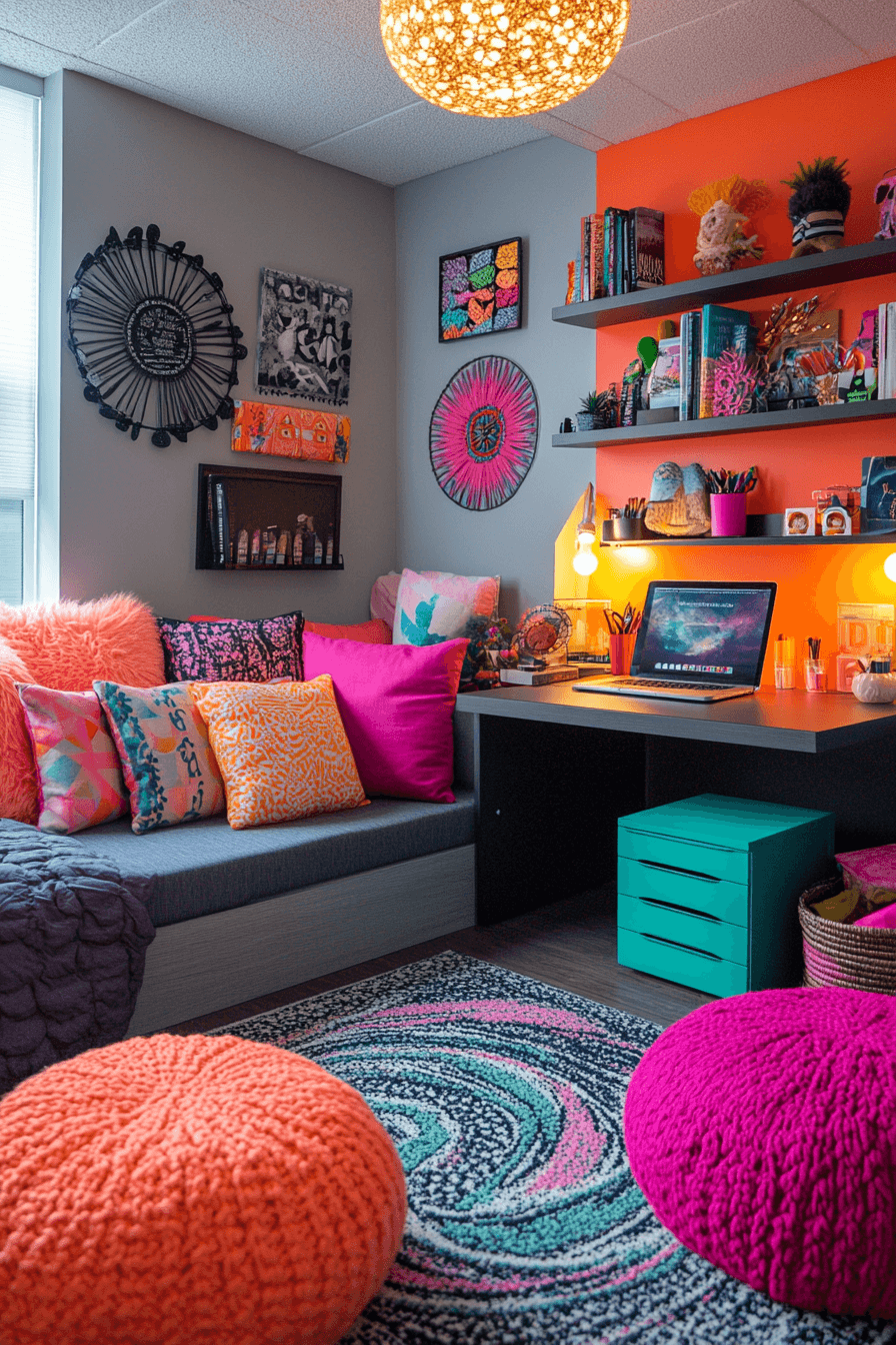 Adding bold pops of color makes a dorm room lively and unique. Bright pillows, rugs, or wall art can energize the space instantly. This is one of the most fun college dorm room ideas because it allows for personality and creativity. A simple neutral base ensures the colors stand out. The overall look feels vibrant and youthful. Tap to explore more bold color pop college dorm room ideas.