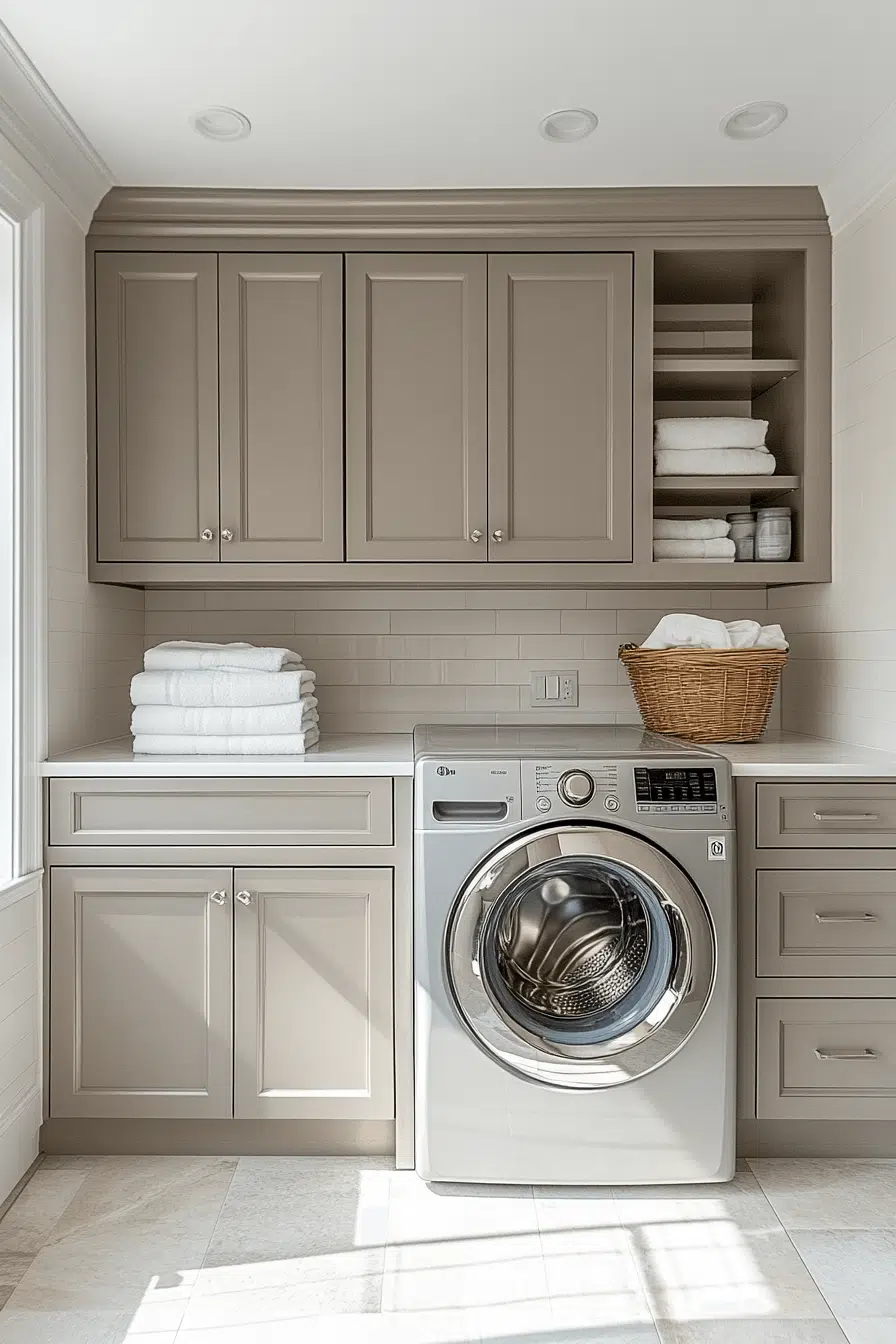 The Soft Gray Cottage Laundry Room brings a quiet calm to your utility space. This cottage laundry room design uses gentle gray tones and white accents for a serene setup. Subtle decor and sleek cabinets keep things feeling light. A timeless, versatile palette.