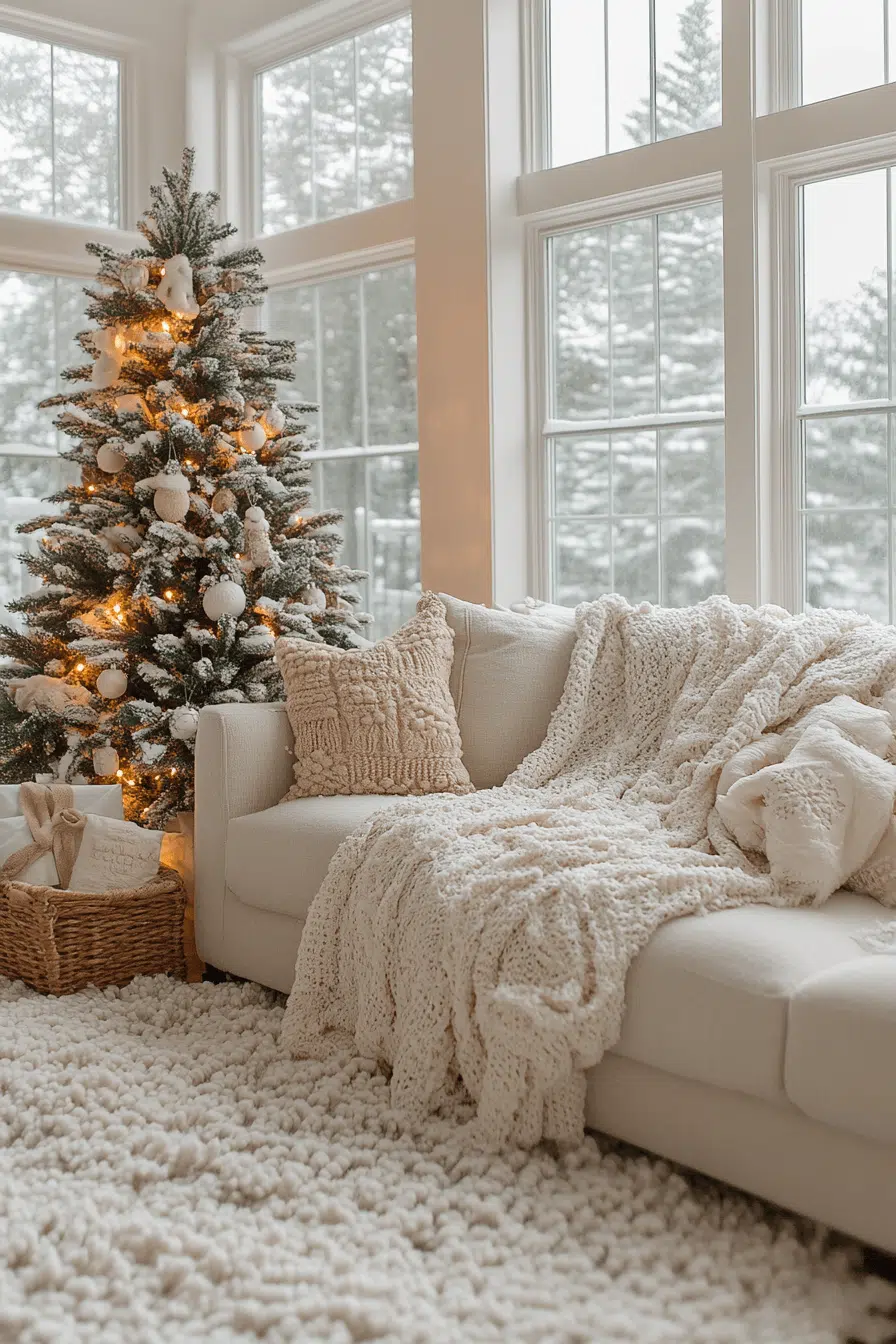 This room feels like the permission slip to slow down—no bright reds demanding attention, just the soft hush of winter light and layers you actually want to burrow into.