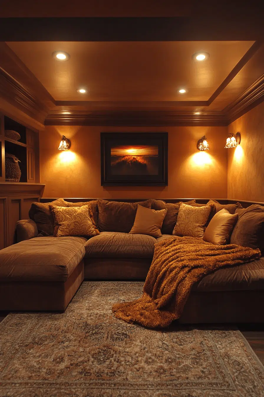 Sunset lounge theme brings warm, amber tones and low lighting to create a cozy basement family room that radiates relaxation. Rich textiles in golden hues paired with a cushioned sectional invite long evenings together. Wall sconces and dimmable lights simulate the soothing glow of dusk. This design makes the space feel embraced and timeless. Plush rugs and earthy accents tie the look together without overwhelming it.