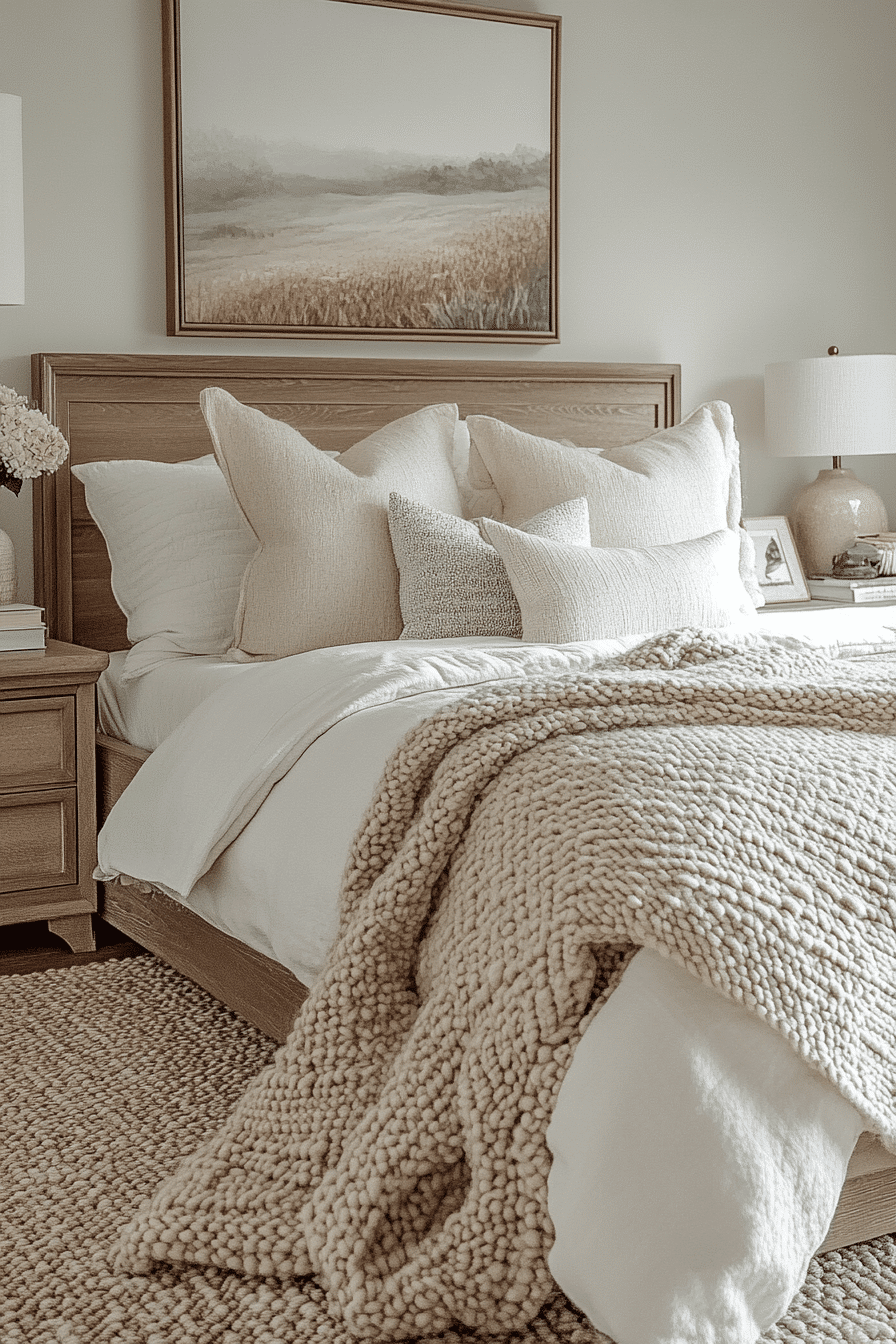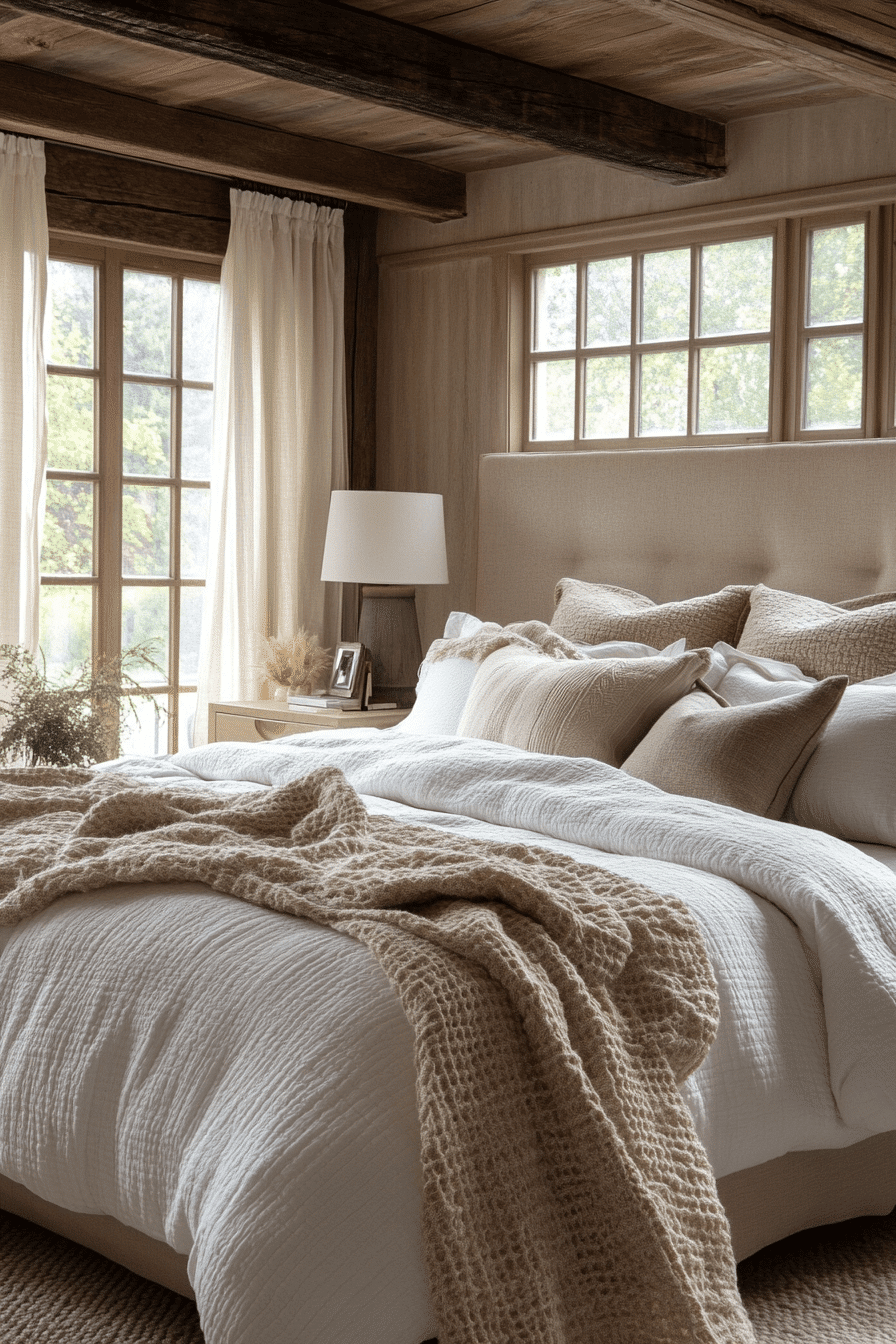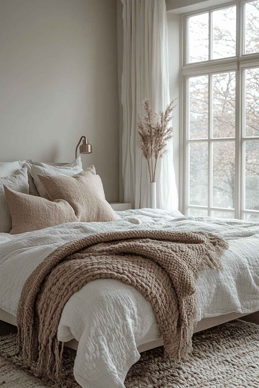 Neutral tones paired with multiple layers of fabrics create a cozy bedroom filled with serenity. From pillows to quilts, layering adds both depth and comfort. The palette ensures the room feels calm and timeless. Neutral layers also allow textures to take center stage, keeping the design visually interesting. This approach guarantees both style and restfulness. Click to find more cozy bedroom looks with neutral layers.