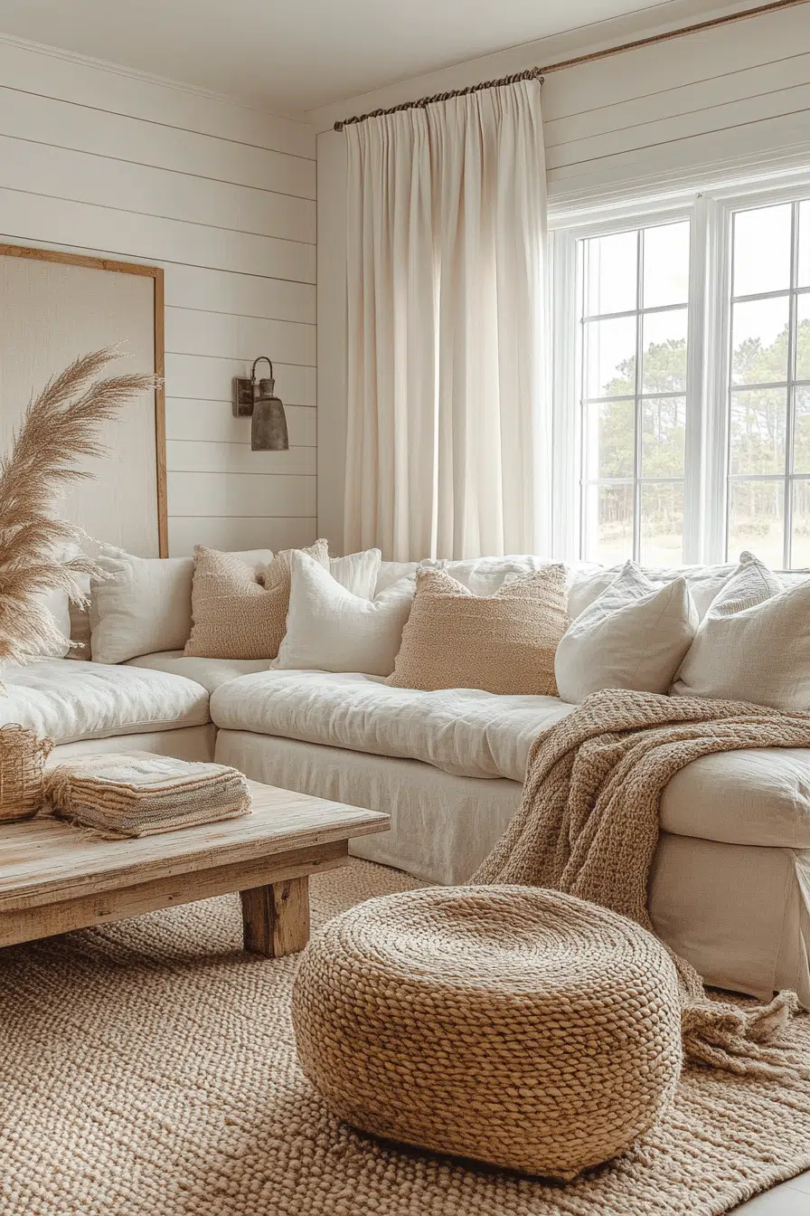 Inspired by sun-worn driftwood, this cozy coastal living room incorporates warm beige, light taupe, and subtle gray tones to mimic the textures of seaside timber. The space is filled with cozy upholstered furniture, giving softness to the organic color scheme. Clean edges and low-contrast styling allow for restful eyes and minds. The lighting is warm and diffused, echoing the way light settles on sand in the late afternoon. It’s an earthy, coastal escape without any clutter.