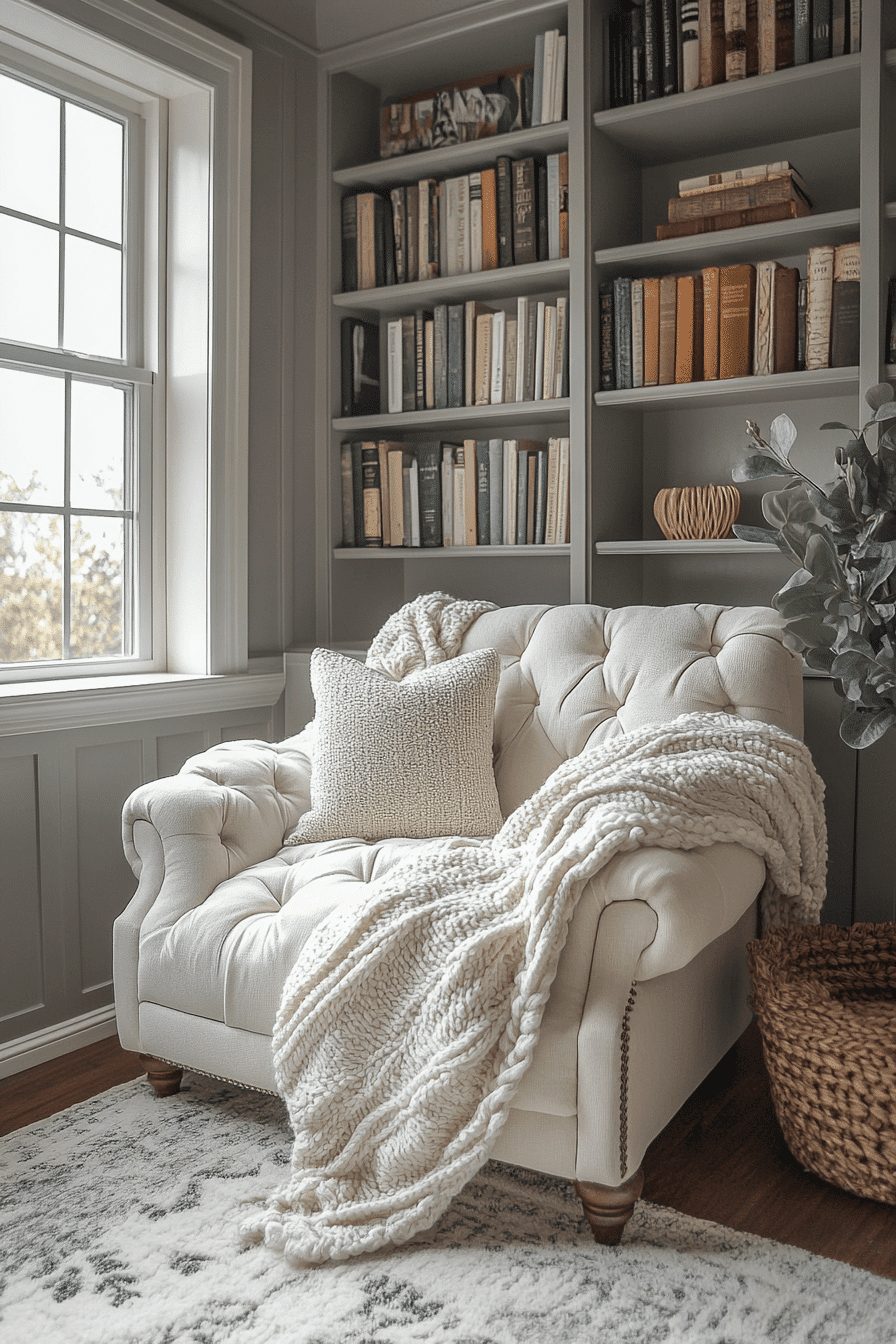 A cozy reading nook offers the perfect serene retreat, allowing you to escape into a world of books while being surrounded by calming colors and plush fabrics. Soft, neutral tones, paired with comfortable seating, create a peaceful space where you can unwind. Adding a soft throw blanket and fluffy cushions will make it even more inviting. Natural light filtering through a window enhances the relaxing vibe. Create a tranquil atmosphere with the soft rustle of pages, and let your cozy reading nook become your sanctuary. Click here to discover more serene nook ideas!