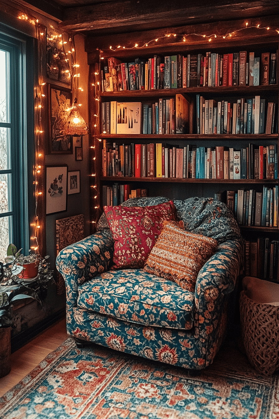 Embrace a boho style with a cozy reading nook that’s as eclectic and free-spirited as your reading list. Layer colorful throws, patterned cushions, and vintage-style furniture for a comfortable yet vibrant atmosphere. Incorporating plants or woven baskets adds a touch of nature, perfect for creating an inviting environment. This nook combines warmth, personality, and comfort, offering a perfect retreat for book lovers. A boho-inspired cozy reading nook is a place where you can immerse yourself in your stories with style. Explore more boho reading haven ideas here!