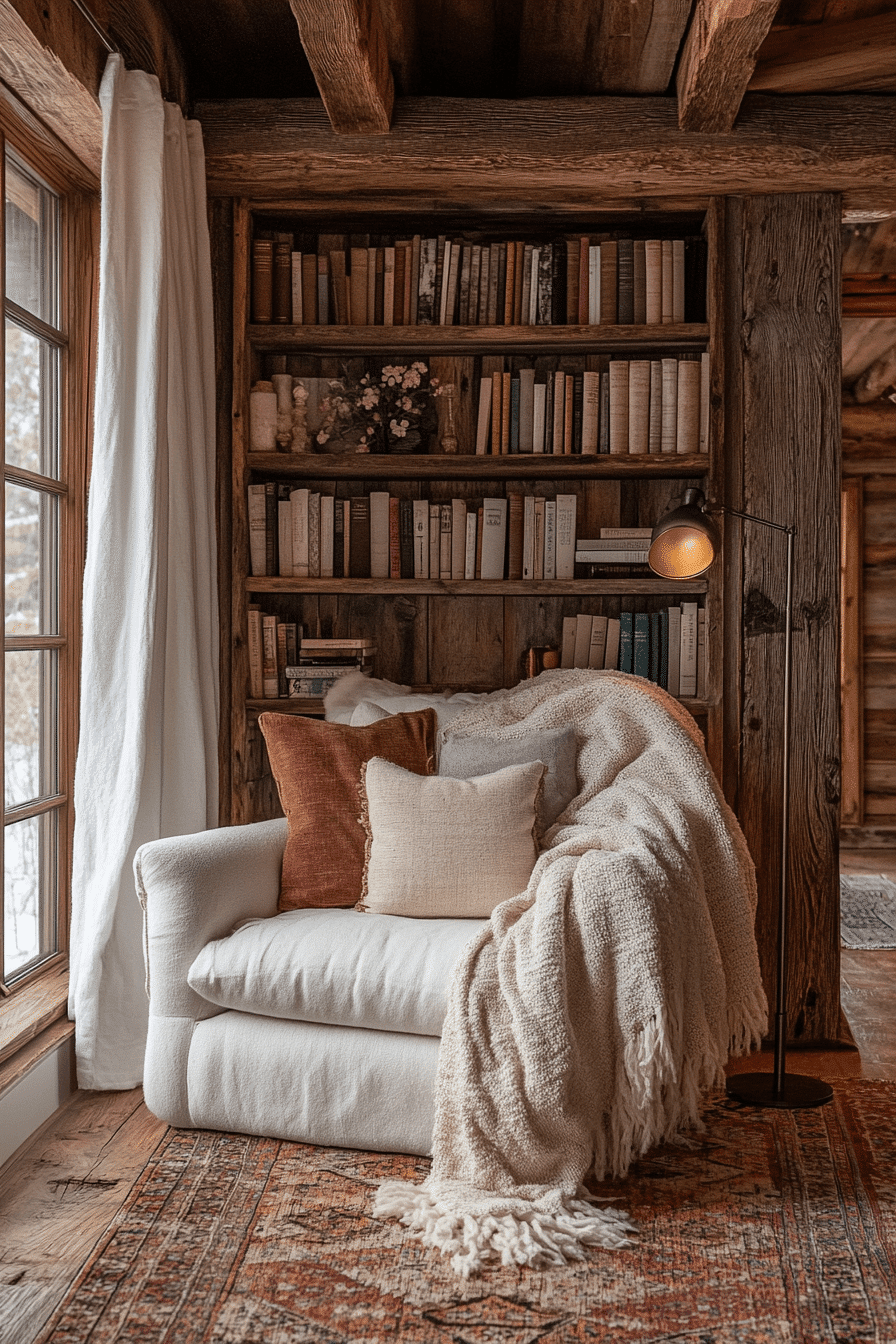 A rustic cozy reading nook combines the warmth of natural wood, soft lighting, and earthy tones to create an inviting retreat. Think wooden shelves, a cozy armchair, and a warm, woolen throw blanket for the ultimate comfort. The natural materials in this nook create a grounded, peaceful environment where you can escape into your book. Rustic touches like exposed beams or a stone wall will add even more charm to this cozy space. Click here for rustic reading escape ideas!