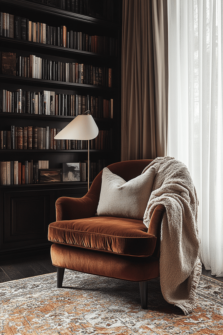 A plush cozy reading nook is all about comfort and luxury. Choose a deep, cushioned armchair or a cozy chaise lounge paired with soft, luxurious throws and pillows. Gentle lighting and plush textures, such as velvet or chenille, add to the inviting ambiance. This nook is perfect for sinking into with a good book and a warm beverage. Click here for more plush reading retreat ideas!