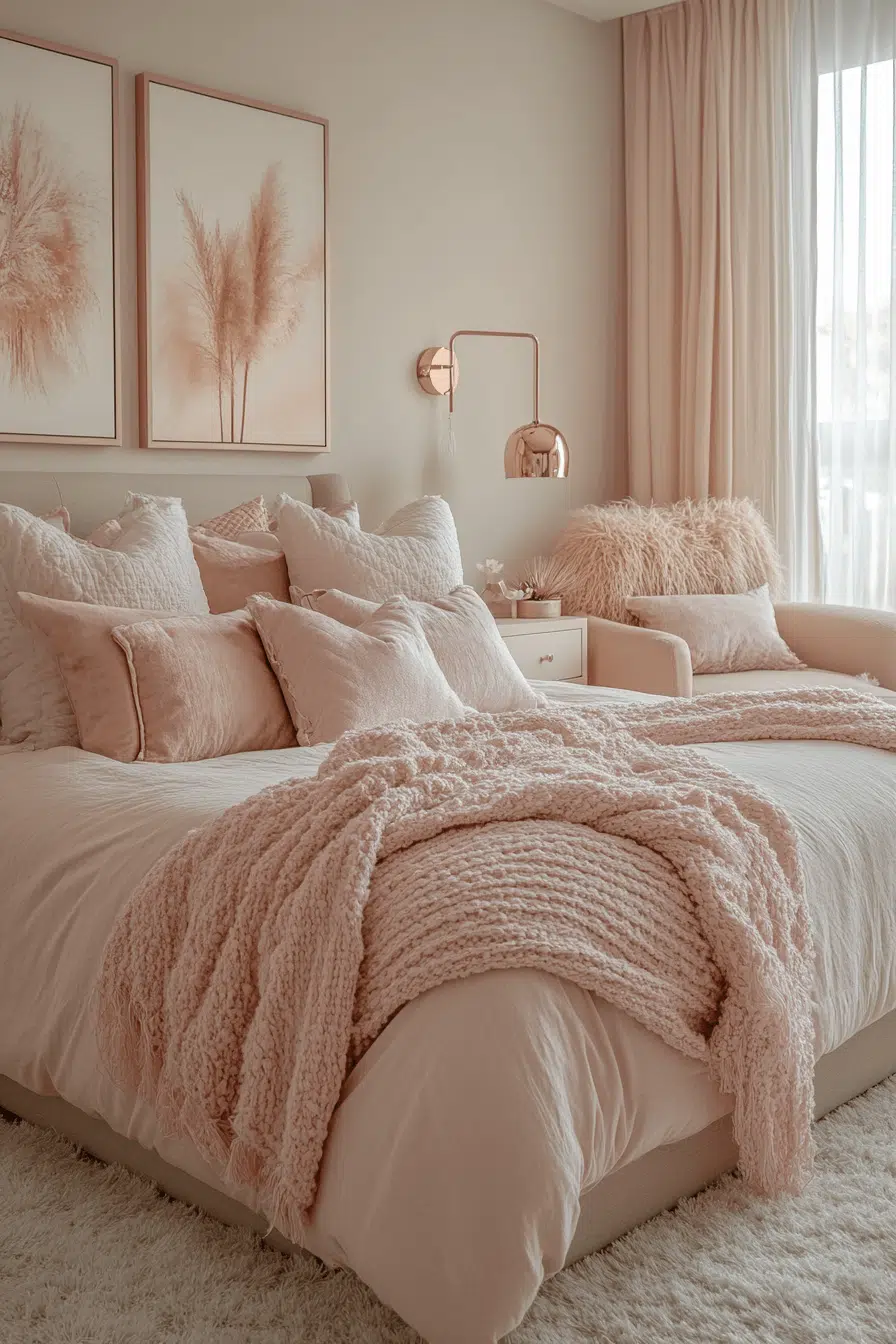Sweet blush suite blends pink tones with soft grays and creams for a feminine but mature cozy teen girl bedroom. Use blush curtains, bedding, and art in different textures for dimension. Include a white or light wood bed frame to keep it light. Add cozy elements like an oversized chair or shaggy rug. It feels sweet but not juvenile.