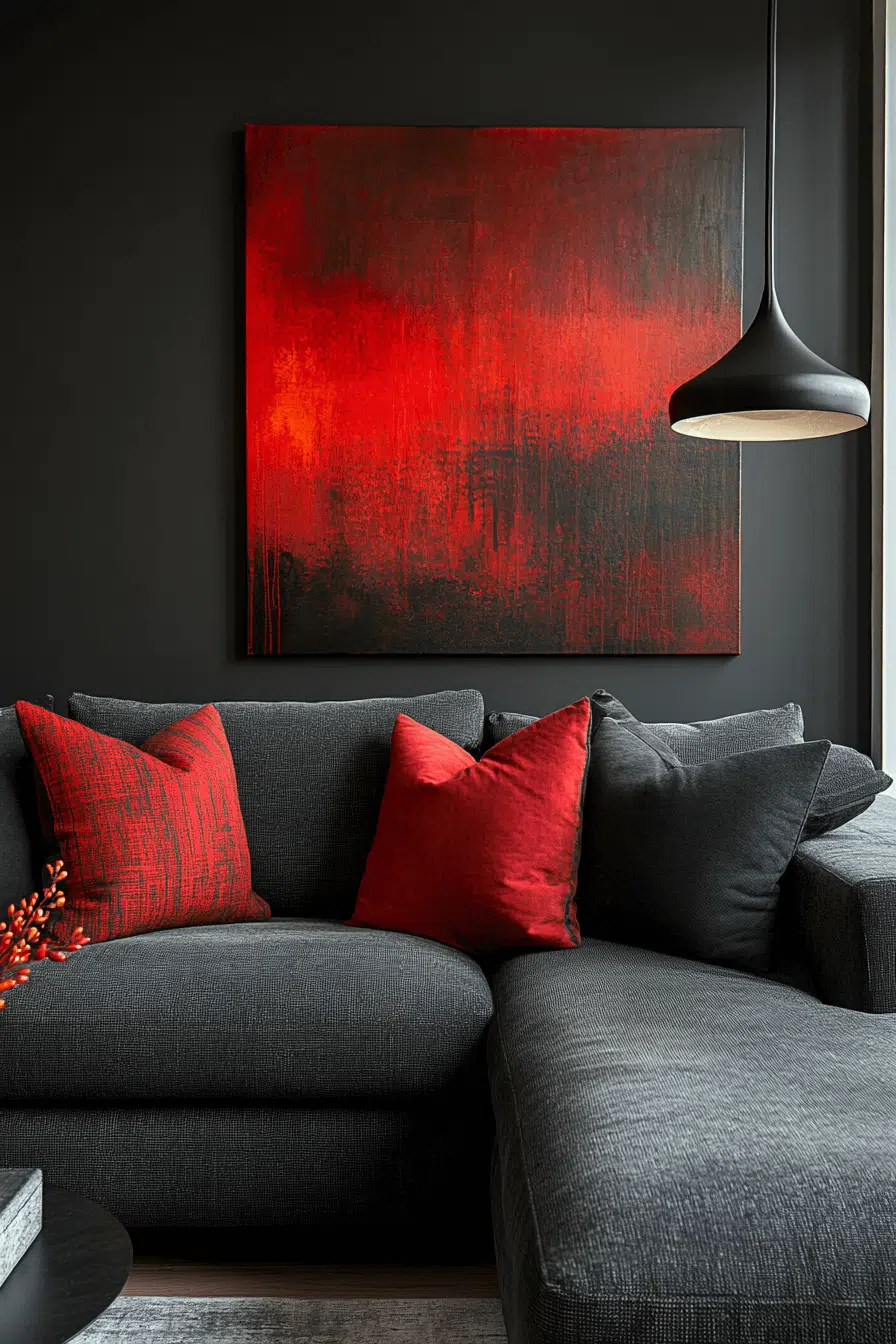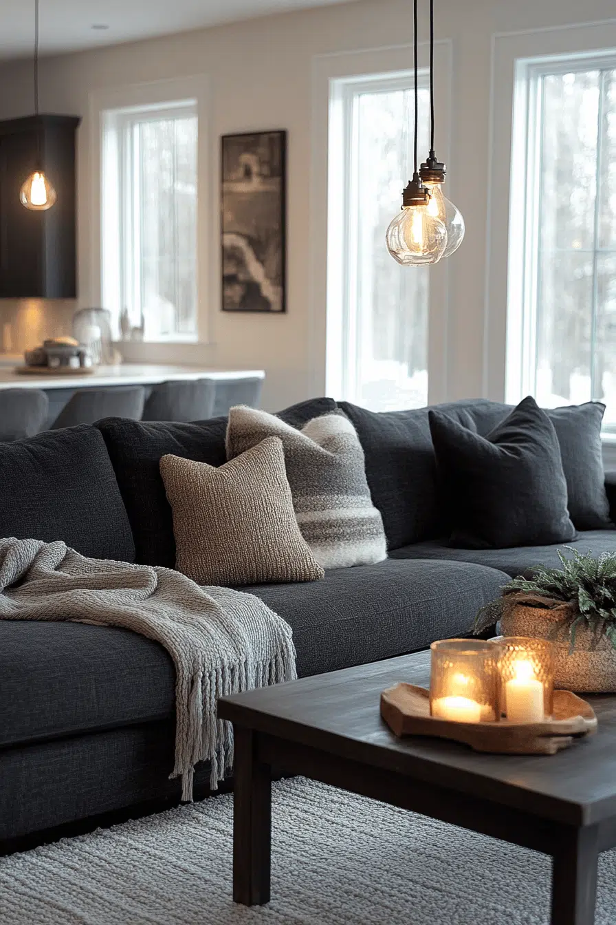 An Urban Onyx Oasis with a dark gray couch offers a chic urban retreat right in your living room. The onyx gray provides a sophisticated backdrop for minimalist furniture and high-tech gadgets, creating a modern, city-like feel. This dark gray couch living room is perfect for young professionals or anyone who enjoys a sleek, trend-forward space. Use geometric patterns and minimalist decor to keep the look sharp and contemporary.
