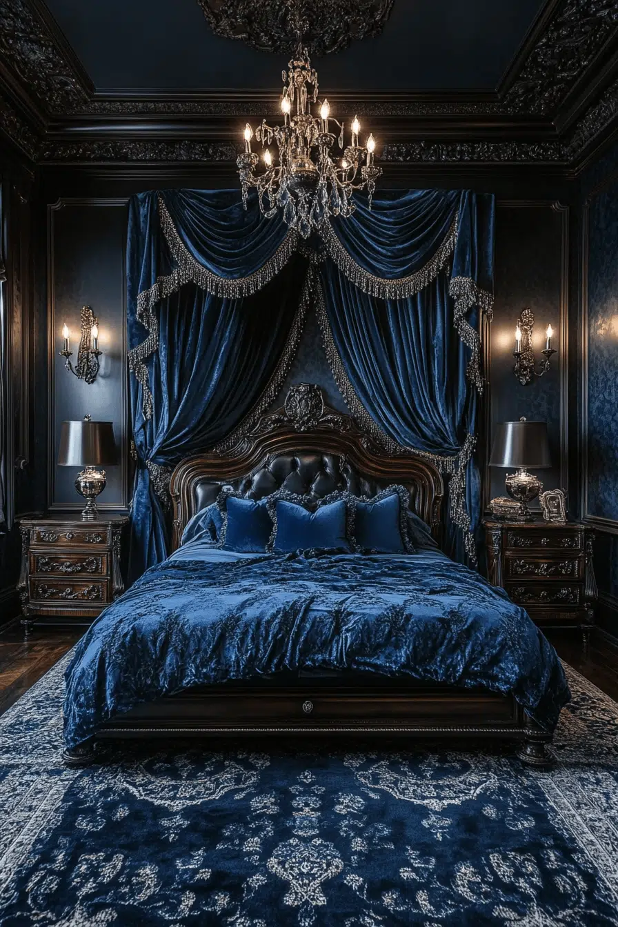 Midnight Majesty Chamber: The Midnight Majesty Chamber epitomizes the quintessential dark Victorian bedroom, with deep midnight blue walls and heavy velvet drapes that create a regal and secluded atmosphere. The ornate, antique furnishings enhance the richness of the room, while dim lighting casts mysterious shadows, perfect for a dramatic flair. Luxurious fabrics and a plush, canopied bed invite you to step back in time to a period of opulence and grandeur. This bedroom is ideal for those who cherish a sense of history mixed with modern comfort.
