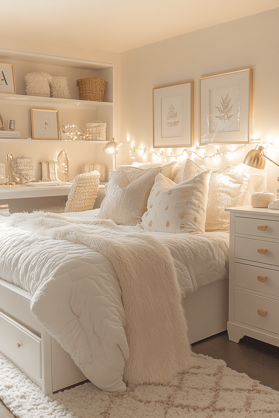 Glam Touch dorm room designs bring sparkle and sophistication to a college space. Think metallic accents, velvet pillows, faux fur throws, and mirrored trays to elevate the aesthetic. Soft lighting and gold detailing add a luxurious feel without breaking the bank. This style turns everyday dorm living into something special. It’s the perfect way to feel chic and cozy in your personal space. Click to see more glam dorm room designs with effortless flair!