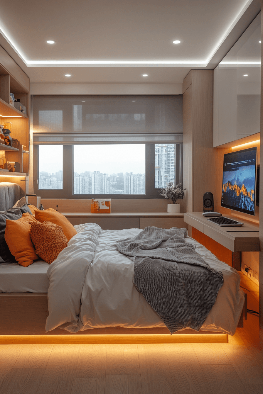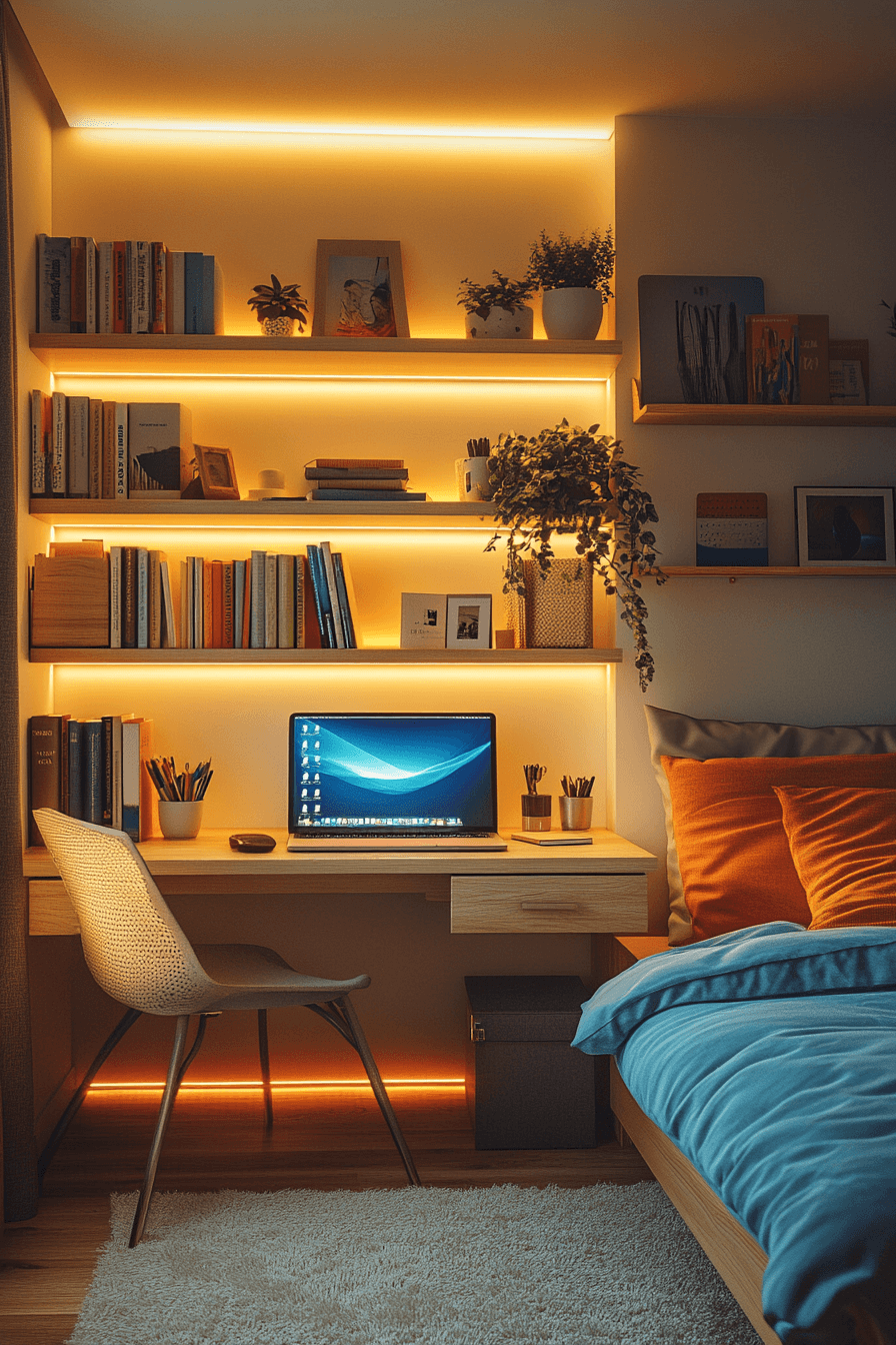 27. Modern Dorm With LED Shelves