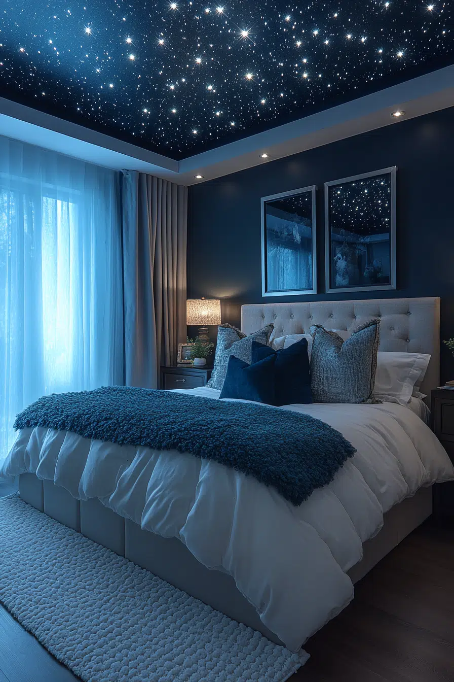 The Celestial Starlight Haven creates a dreamy atmosphere with a ceiling adorned with twinkling LED stars, mimicking a clear night sky. This dream bedroom inspiration captures the tranquility of the cosmos, perfect for those who find peace in stargazing. Soft, dark hues and reflective surfaces enhance the starlight effect, making the bedroom feel both spacious and intimate. Luxurious bedding and minimalistic decor keep the focus on the celestial theme, inviting relaxation and contemplation.