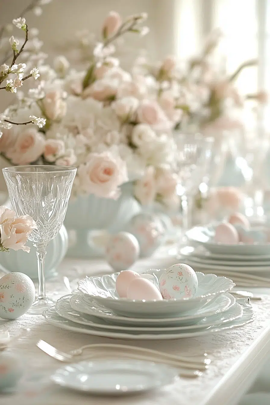 Pastel table settings are a staple for Easter decor ideas, bringing soft, refreshing colors to your dining experience. They work well because pastels are synonymous with spring and can be paired easily with other Easter-themed decorations. Using pastel-colored tablecloths, napkins, and dinnerware creates a cohesive look that’s both inviting and festive. Adding some floral centerpieces or small Easter-themed trinkets can enhance the table’s visual appeal.
