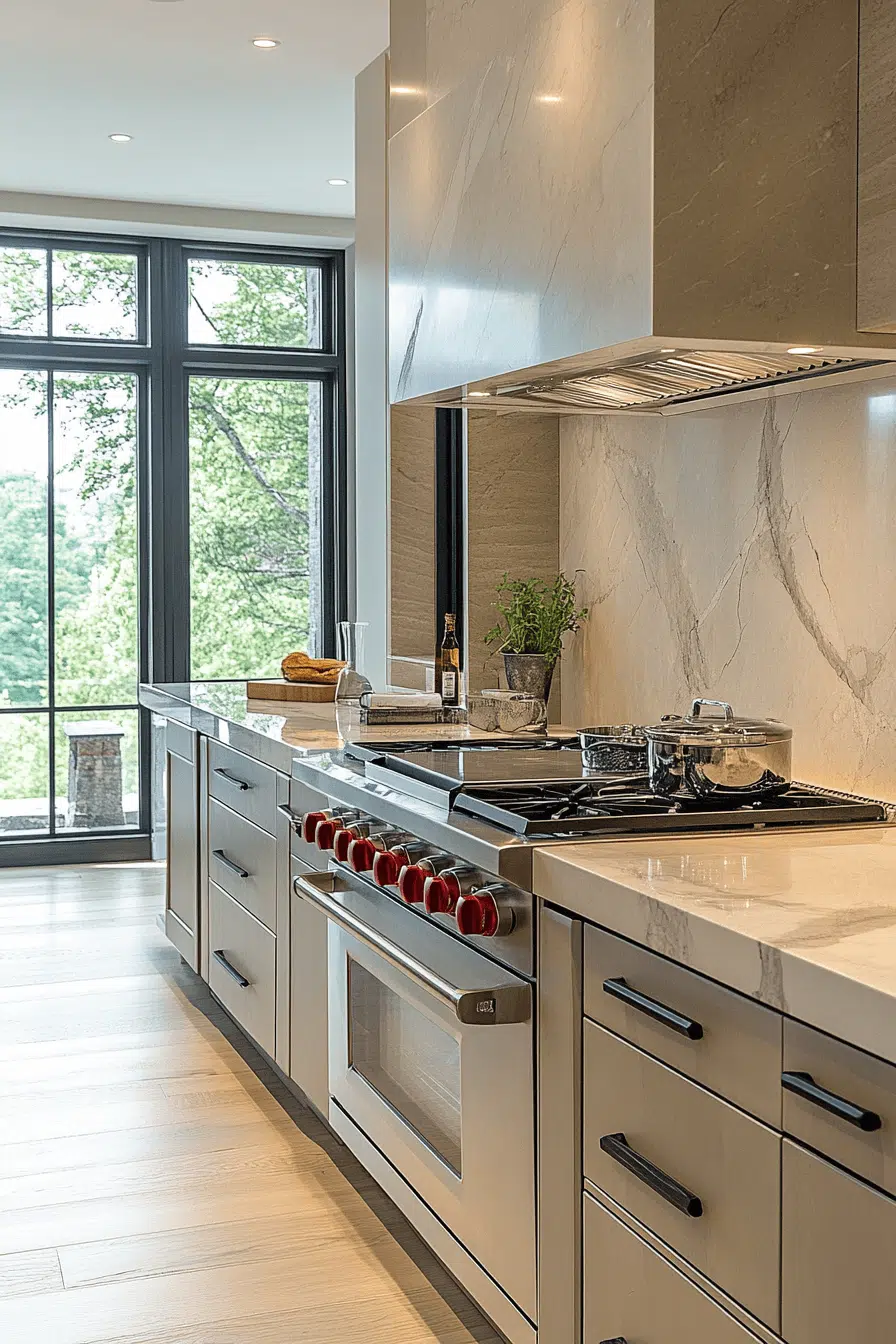 Sublime Serenity: Sublime Serenity in elegant kitchen design offers a peaceful retreat with its soothing color palette and fluid design lines. The kitchen incorporates elements like a Zen garden window or a waterfall countertop that enhance the serene atmosphere. The use of natural light is maximized to illuminate the space softly, complementing the tranquil design. This kitchen is ideal for those who value a calm, soothing environment where elegance and serenity coexist beautifully.