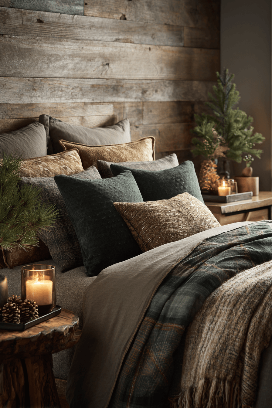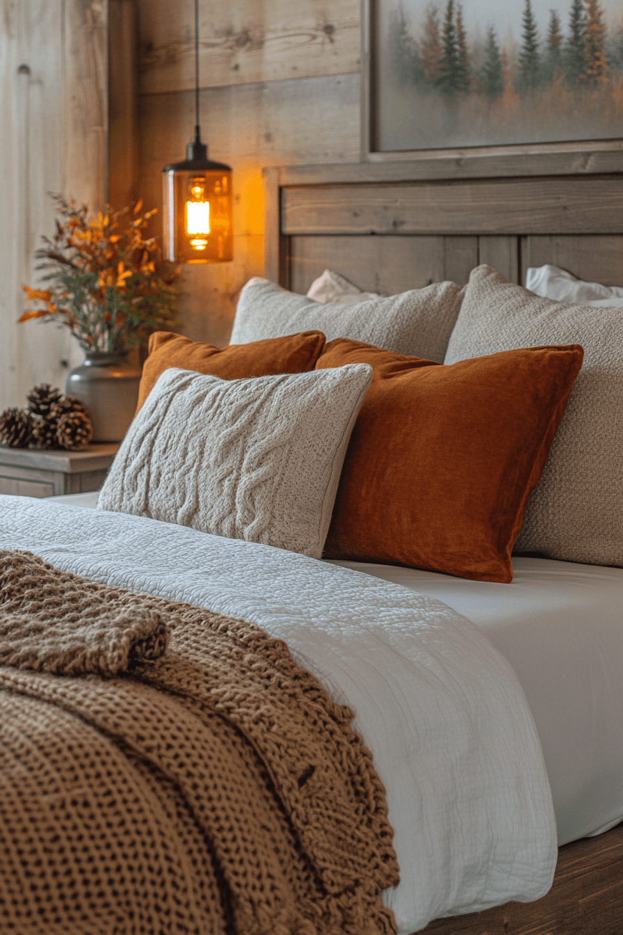 Accent pillows in forest tones add depth to fall bedroom decor. Deep greens, browns, and golds evoke the beauty of nature. Their colors pair perfectly with plaid or neutral bedding. Mixing sizes and fabrics adds interest. These accents create a layered, cozy look. Tap here for more pillow styling inspiration in fall bedroom decor!