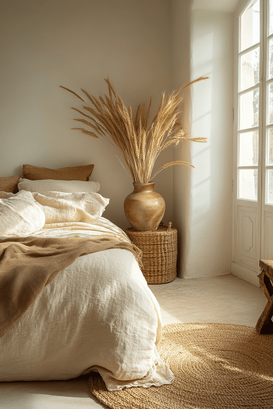 A bundle of wheat adds texture and harvest charm to fall bedroom decor. Placing it in a ceramic vase creates a simple yet impactful display. Its golden color reflects the warmth of autumn. Wheat brings a natural element that feels both rustic and elegant. This detail makes your bedroom feel complete and seasonal. Discover more harvest-inspired fall bedroom decor ideas by clicking here!