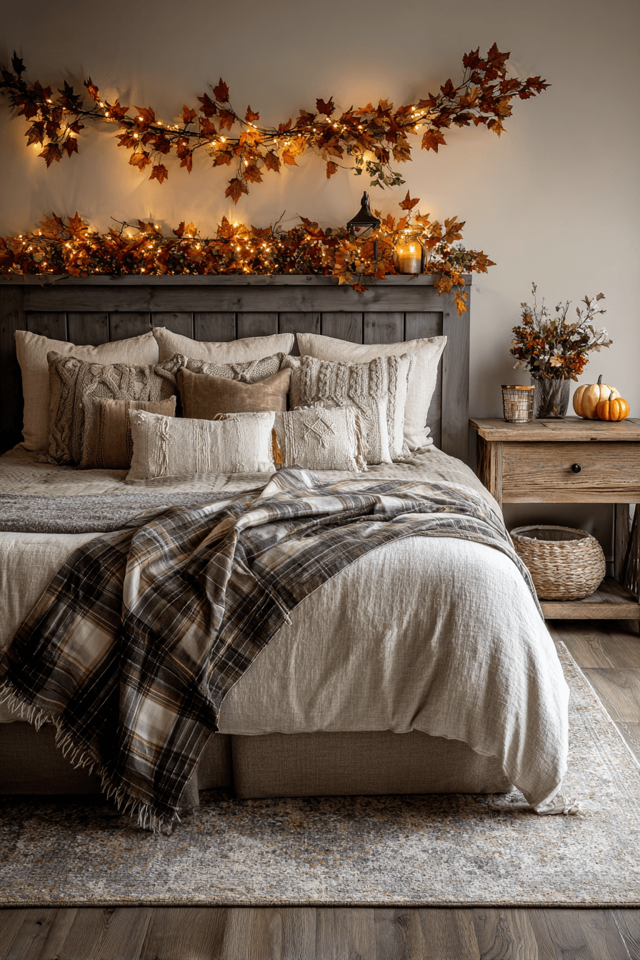A garland draped across the headboard brings festive flair to fall bedroom decor. Leaves, berries, and pumpkins make it seasonal and cheerful. The garland frames the bed beautifully, creating a warm focal point. It’s an easy DIY touch that elevates the room. Adding fairy lights makes it even more magical. Click here to see more creative garland ideas for fall bedroom decor!